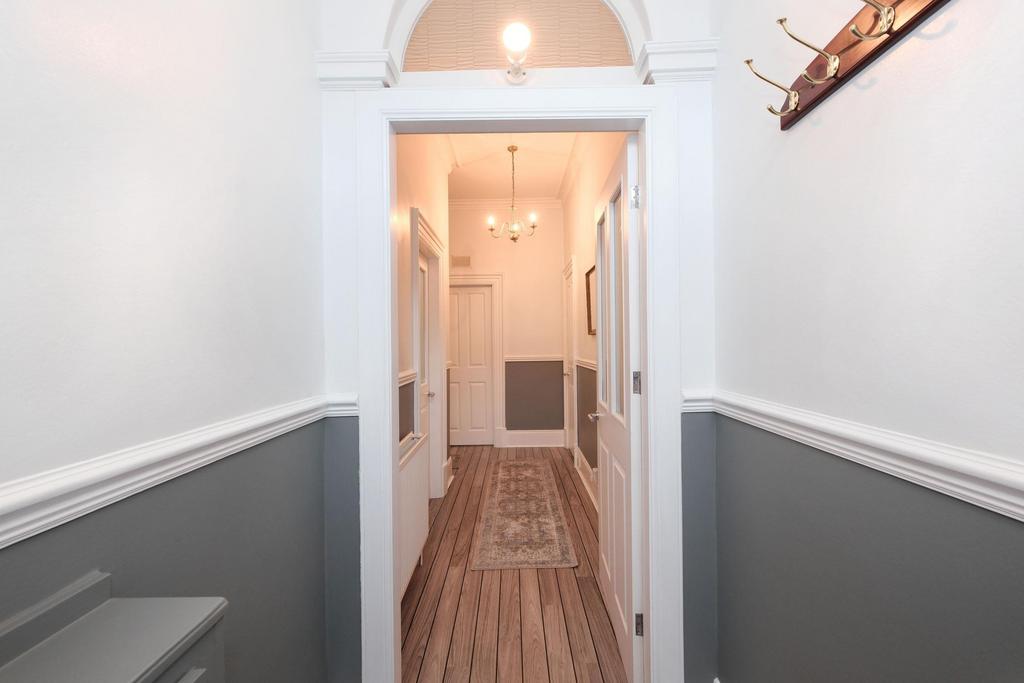 L-shaped hallway with neutral decor, wood laminate flooring, chandelier light fitting, white gas mains radiator. Large built-in cupboard- could be converted into a W/C or home working space- measures 1.22m x 2.18m.