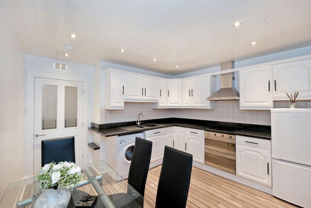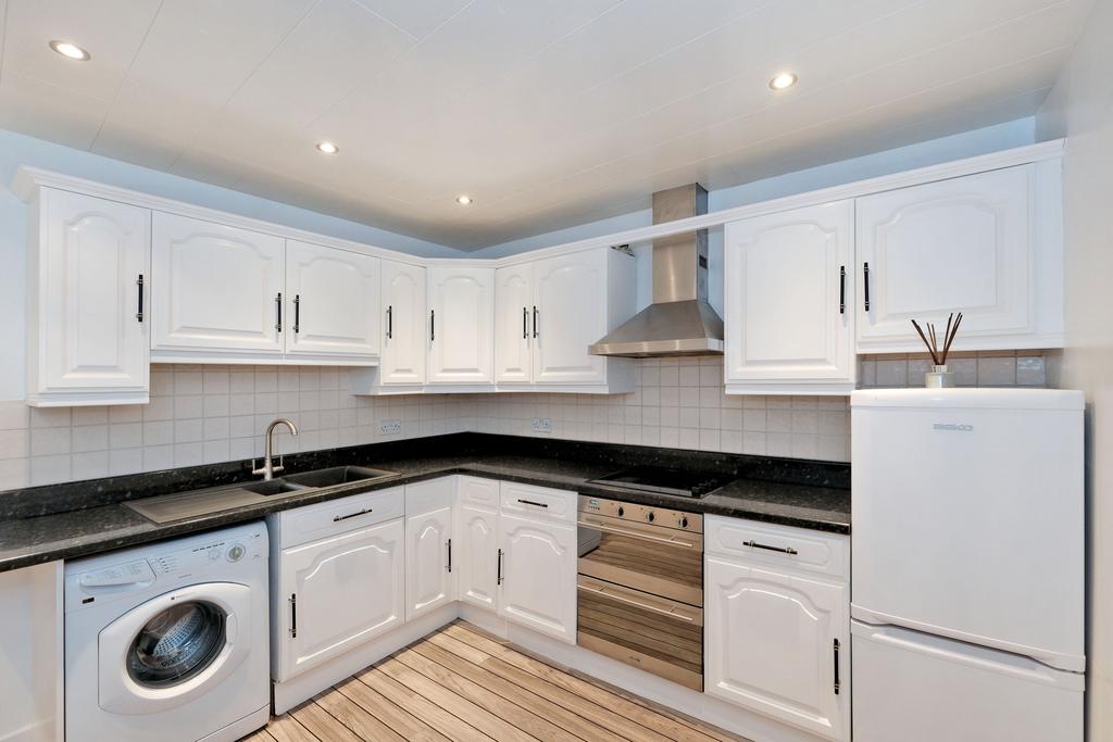 Bright and neutral kitchen with white units and black Granite effect worktop with one and a half bowl sink with mixer tap, appliances include: fridge freezer, washing machine, integrated dishwasher and electric hob, grill, oven and extractor above. Ample space for dining table. Rear facing window and blinds. Wood laminate flooring.
