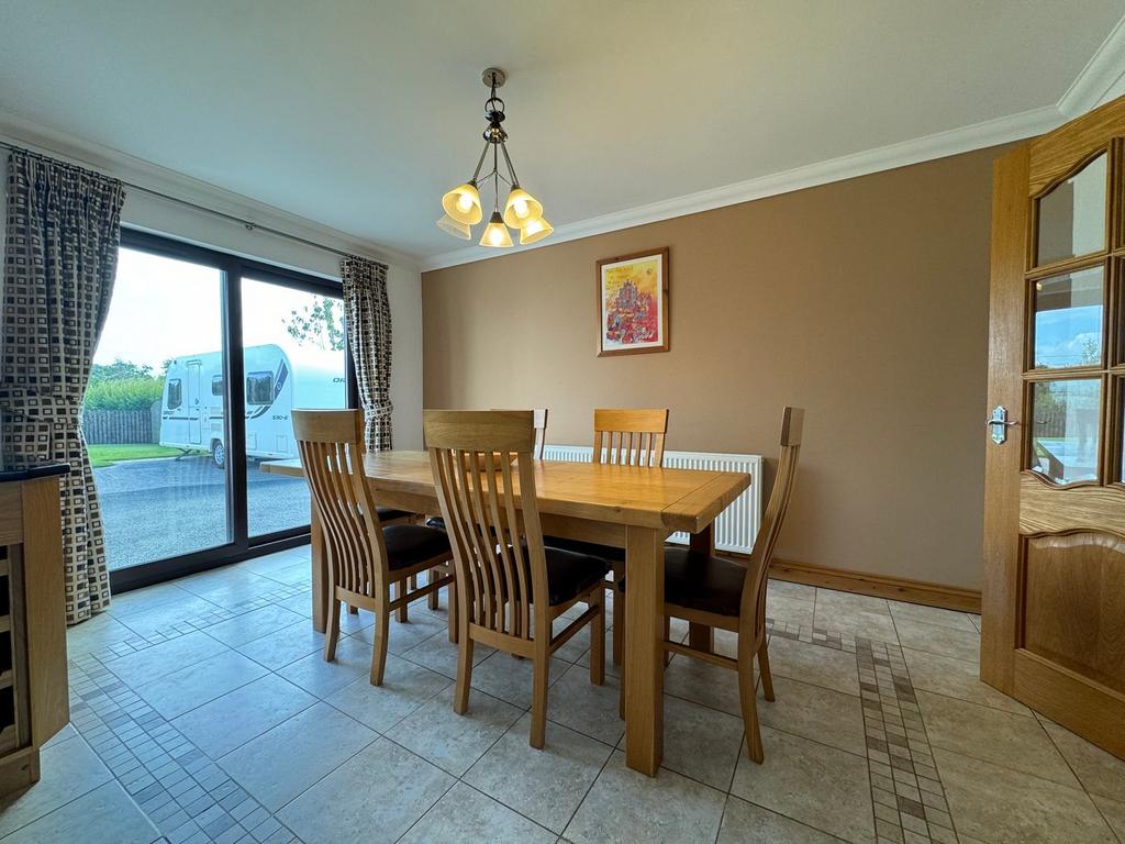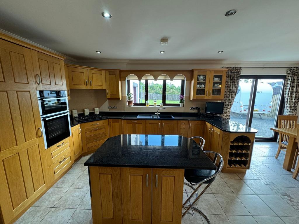16' 9" x 22' 6" (5.11m x 6.86m) with custom made oak kitchen base and wall units with Granite worktop, 1½ sink and drainer with mixer tap, double oven and grill, Bosch gas hobs with extractor over, fitted dishwasher, fitted fridge/freezer, kitchen island with integral microwave and granite worktop, deep saucepan drawers, side seating area, rear window to garden, tiled flooring, spotlights to ceiling. Dining area with space for 6+ persons table with sliding patio doors to garden area, radiator, multiple sockets, spotlights to ceiling.