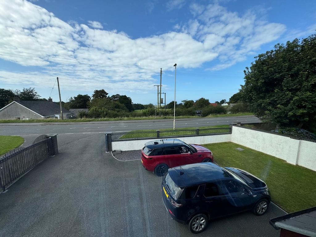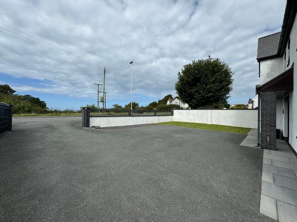 The property is approached from the A487 into a walled forecourt area with a tarmacadam driveway and parking for 3+ cars and footpaths leading to front door and to rear garden area, also with continuing tarmacadam driveway and patio leading to the garage.
