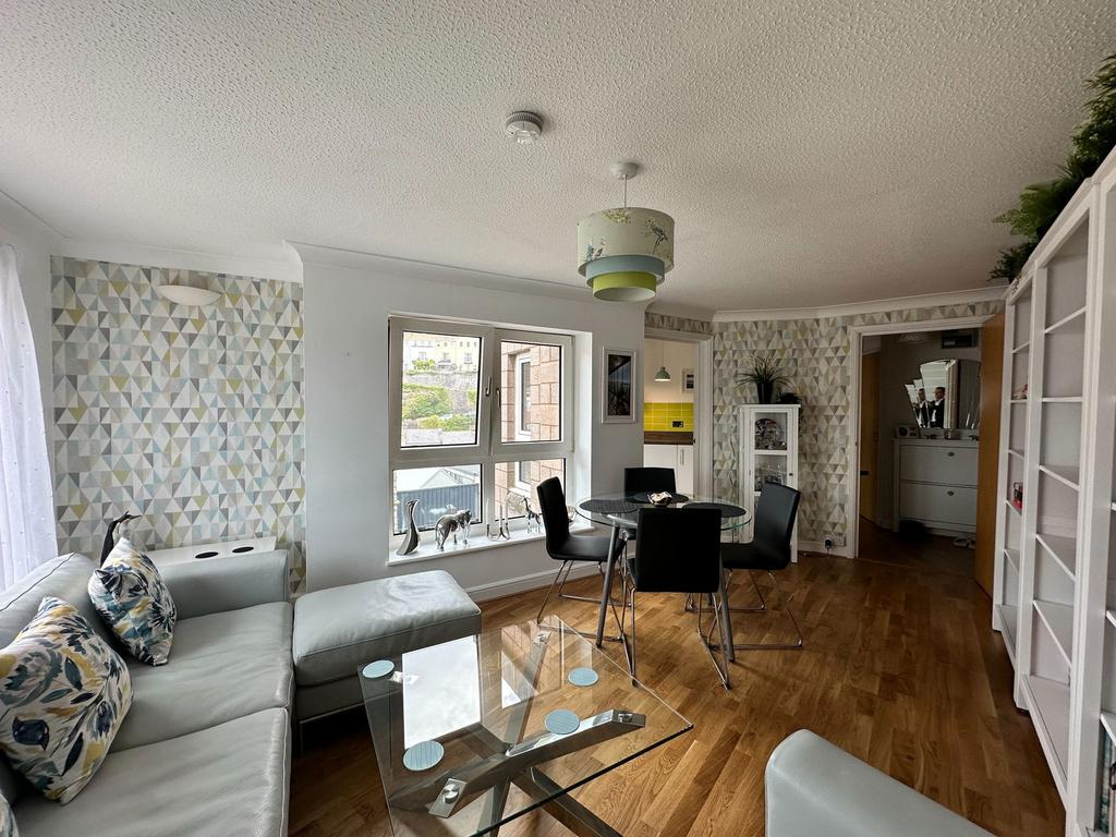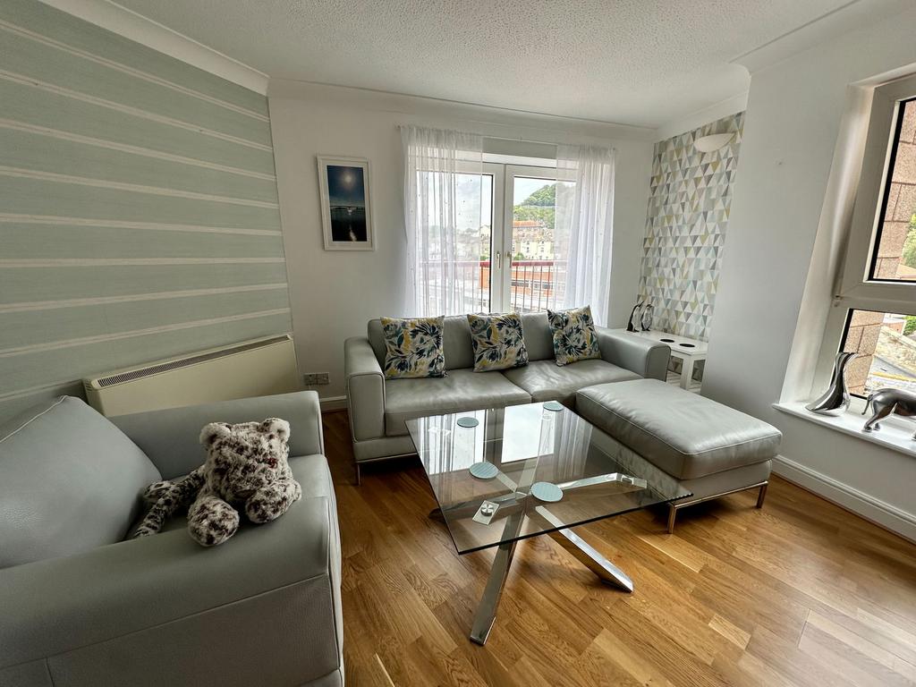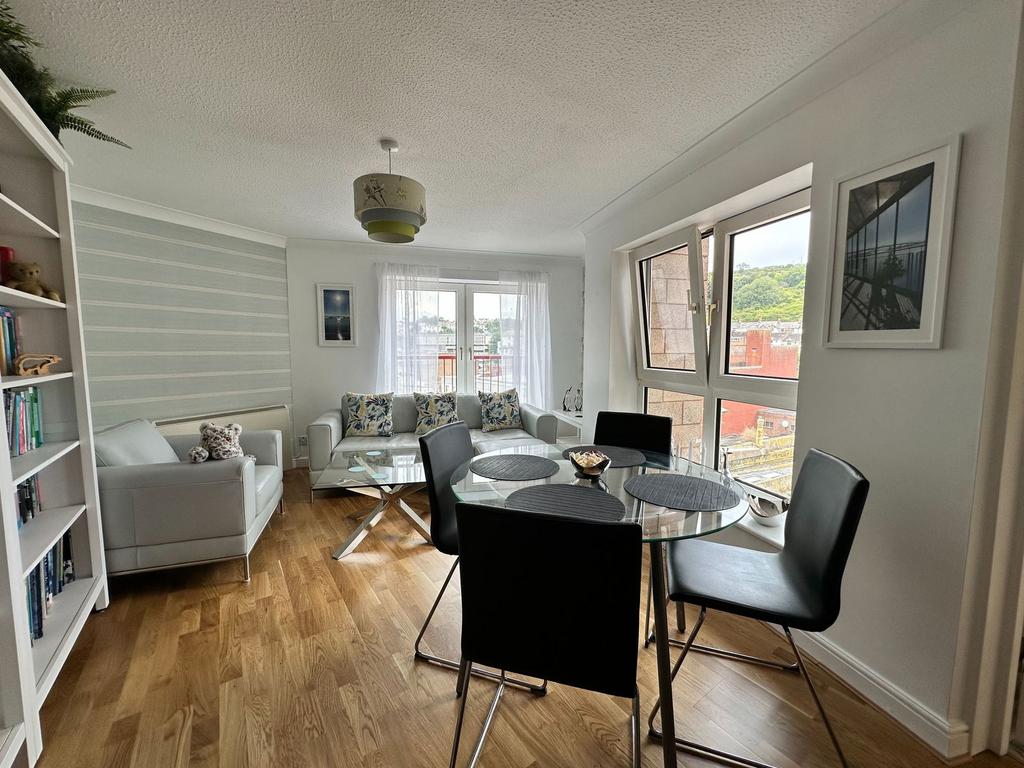 A spacious and bright room with double aspect double glazed windows overlooking Torquay town centre up towards Castle Circus in the distance. There is space for 3 piece suite and dining table. Night storage heater. Glazed door leading to:
