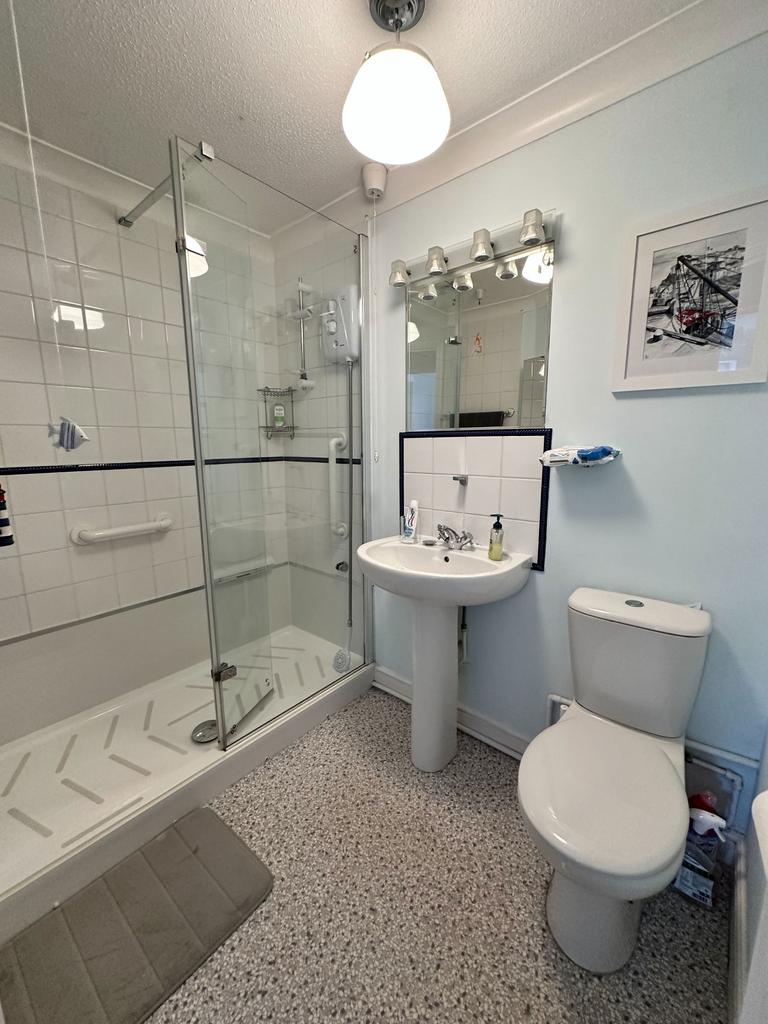 Fitted with a modern white suite having a double walk in shower area with glazed splash screen and electric shower there is also a seat and grab rails if required. Pedestal wash hand basin with mirror. Close coupled WC with dual flush. Part tiled walls. Wall heater. Emergency pull cord.