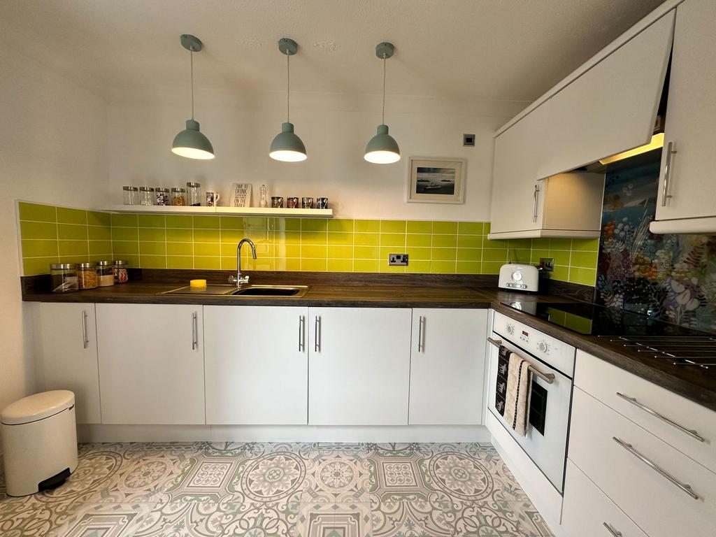 Fitted with a modern range of white wall and base units with dark wood grain effect work surfaces over. Integrated electric hob with cooker hood over and electric oven/grill below. Integrated Fridgemaster refrigerator and also Hotpoint washer/dryer. Tiled walls double glazed window with similar outlook to the lounge.