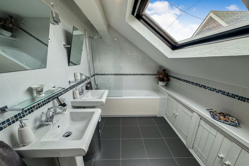 Upstairs, the first-floor landing offers a versatile space currently used as an office area, leading to two generously sized double bedrooms. Each bedroom is equipped with fitted wardrobes and enjoys beautiful views. The modern family bathroom features a luxurious suite with "Jack and Jill" basins and a Velux window that bathes the room in natural light.