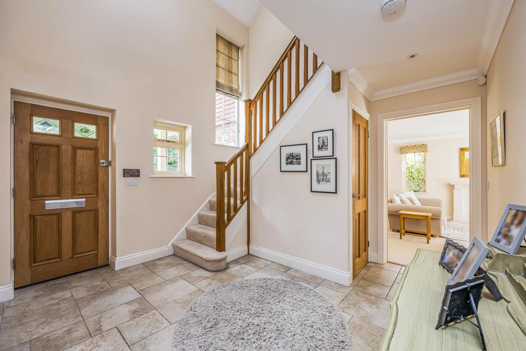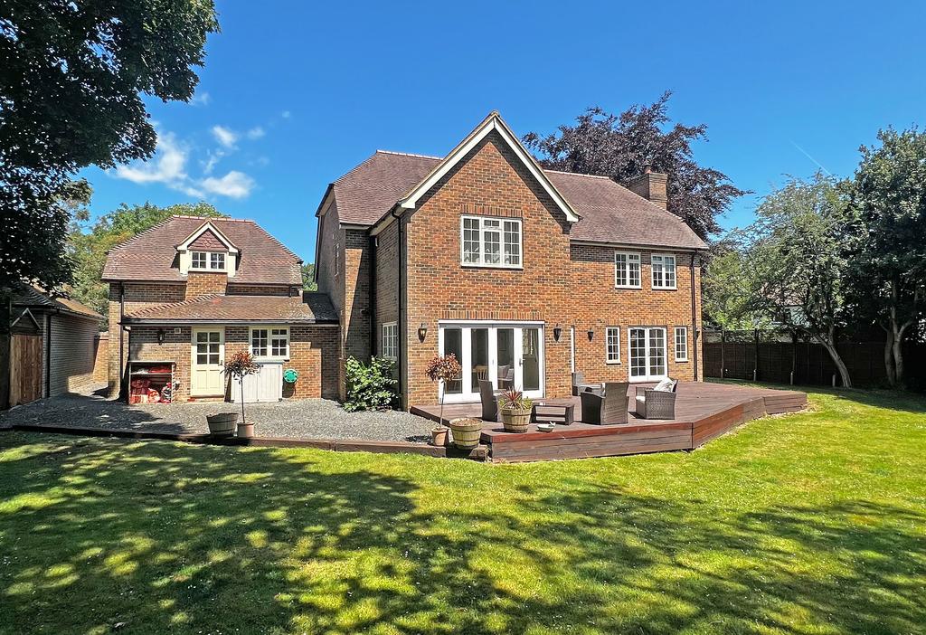 Kingley is approached from a long shared driveway flanked on one side by mature beech hedging leading to a five-bar gate opening into an extensive parking for a number of vehicles. There is also an outside water tap and raised planters at the front of the property and a wonderful magnolia tree. The gardens surround the house and the rear aspect is principally south facing with a large entertaining timber decked terrace the full length of the property and approached by way of doors from the sitting and dining room areas and the kitchen/breakfast room. There is a lovely private leafy rear aspect and the decked terrace leads down to a wide expanse of neatly kept lawn, surrounded by a number of well established trees including Scots pine, silver birch and oak. In all, set in about 0.27 acres. It is understood the owners of Mirembe and Kingley share costs of maintaining their shared driveway.