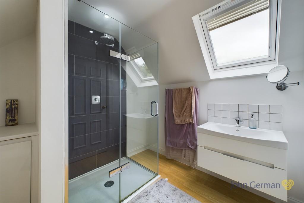 Upstairs, the master bedroom offers a luxurious retreat with its own en-suite and dressing room. The en suite offers a walk-in shower enclosure, skylight window, wash hand basin and low-level flush WC.