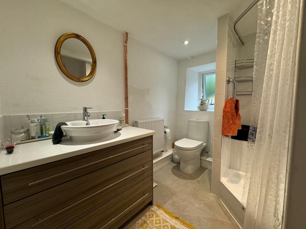 6' 6" x 8' 5" (1.98m x 2.57m) enclosed tiled shower unit, WC, heated towel rail, single wash hand basin on vanity unit, radiator.