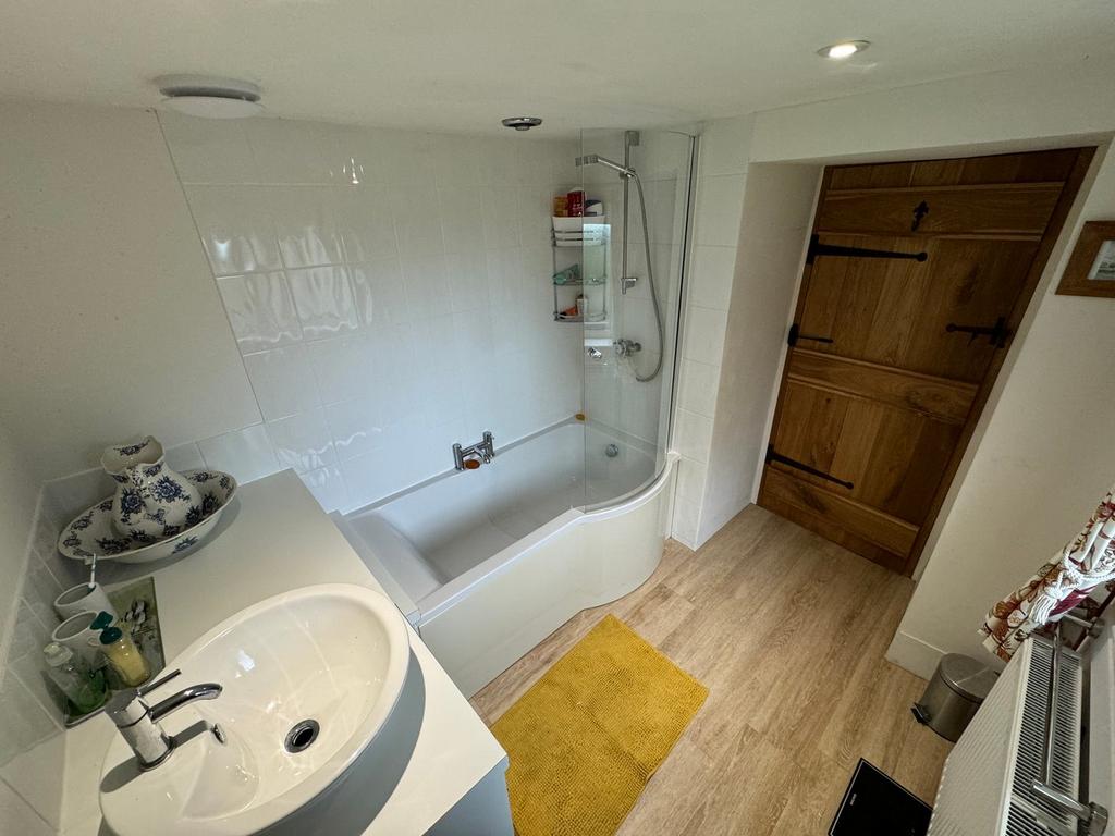 7' 8" x 7' 0" (2.34m x 2.13m) with white bathroom suite including 'P' shaped bath with shower over, single wash hand basin on vanity unit, WC, radiator, wood effect flooring, spotlights to ceiling, part tiled walls, side window
