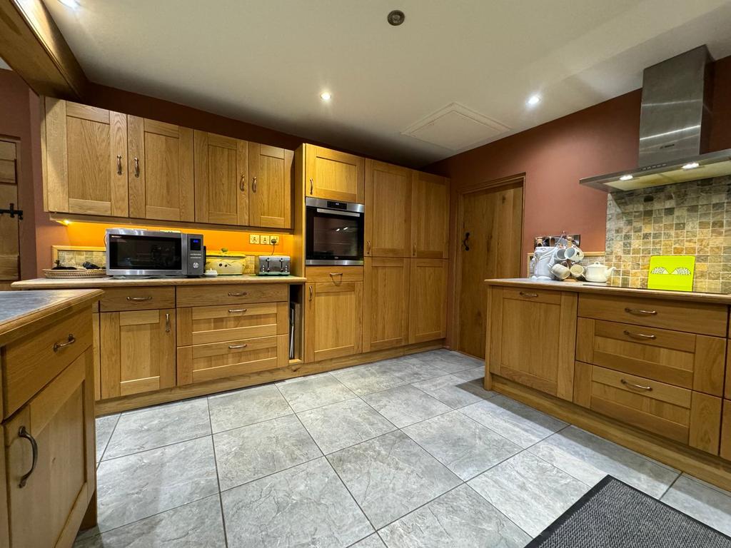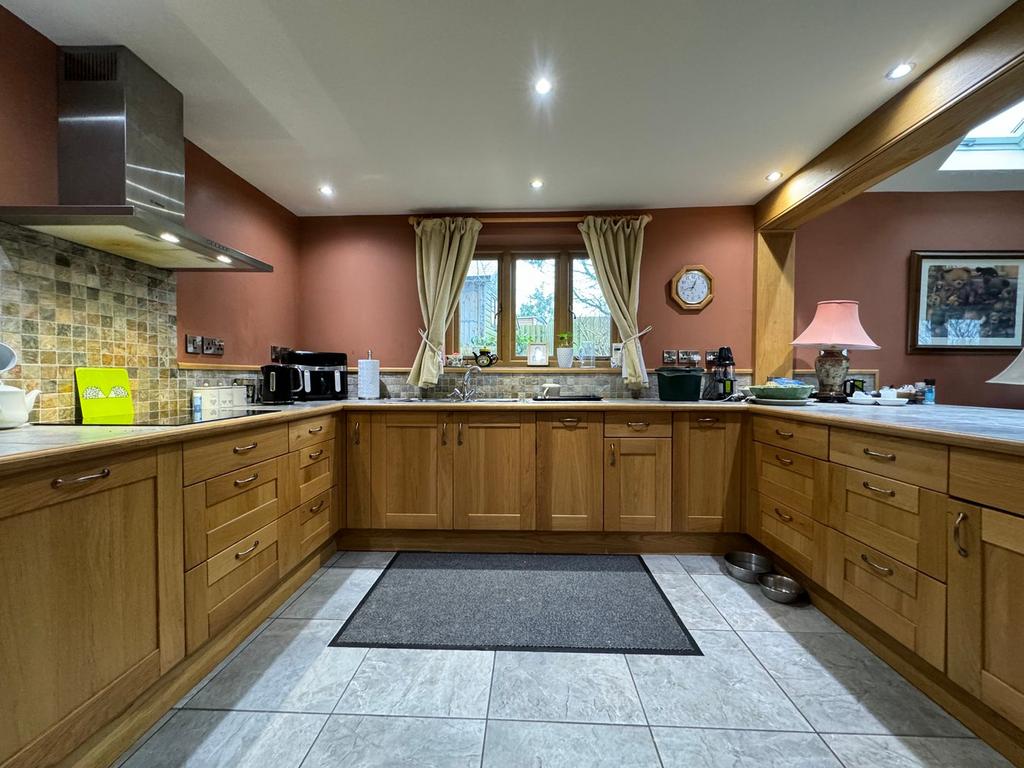 Kitchen area with custom made oak base and wall units, tiled work surfaces, dual stainless steel sink and drainer with mixer tap, induction hobs with extractor over, tiled splashback, fitted dishwasher, integrated oven and grill, fitted fridge/freezer, window to rear garden, window to side garden, tiled flooring, open plan into
