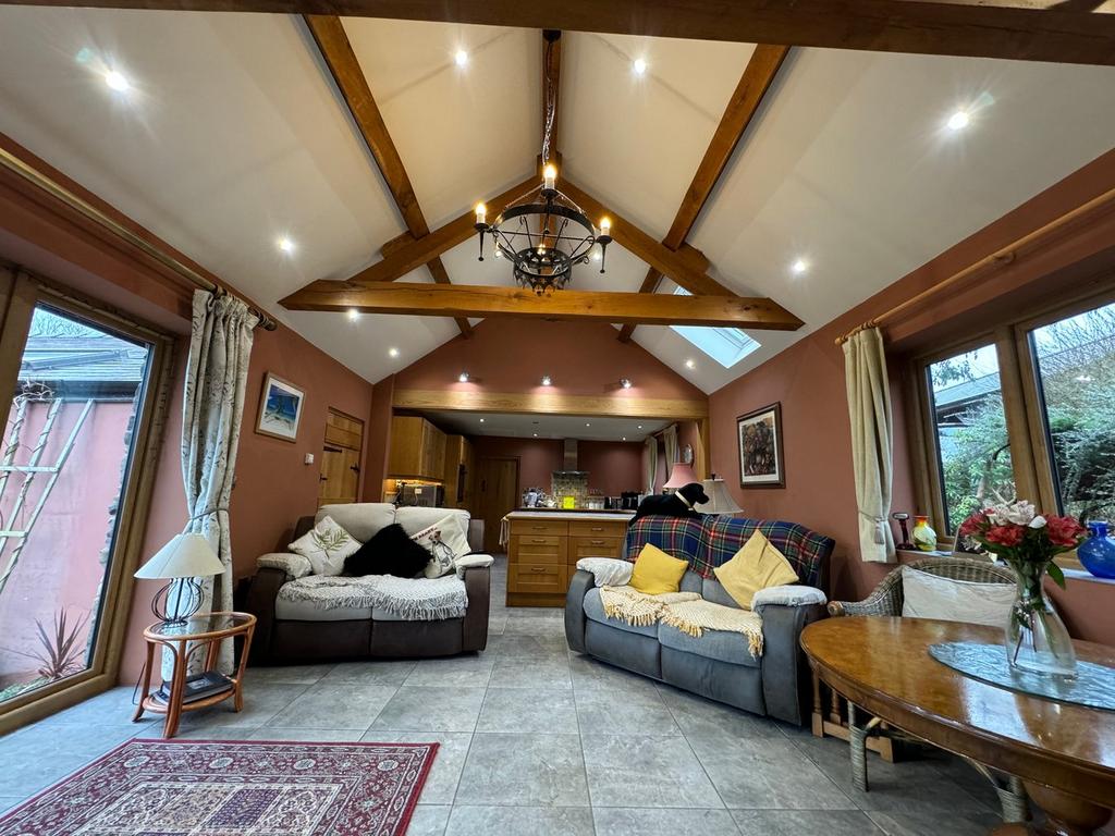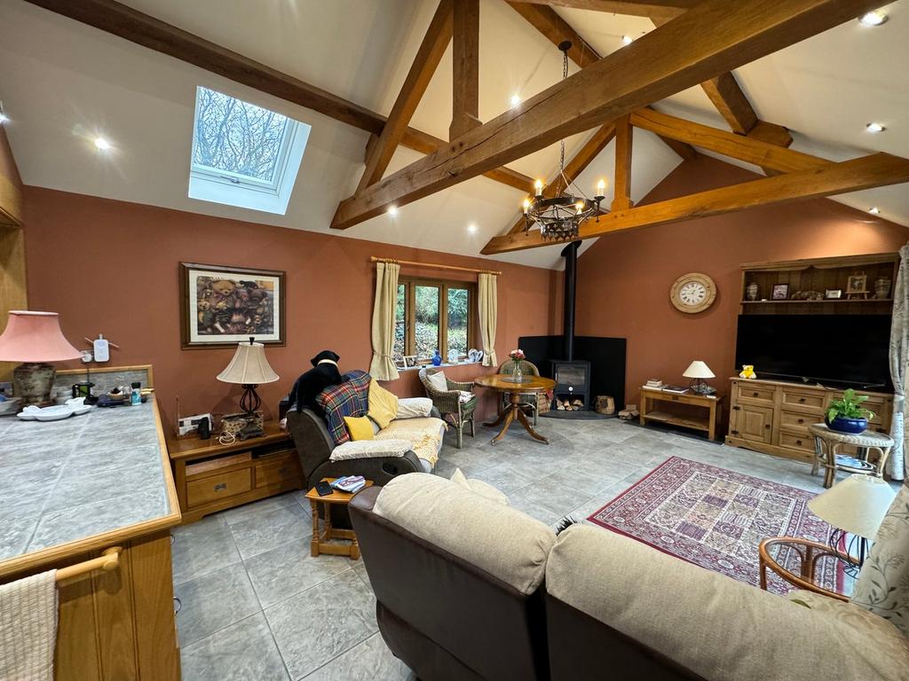 33' 0" x 13' 0" (10.06m x 3.96m) an open plan living space with feature 'A' frames and beams to ceiling, Velux rooflights over and floor to ceiling patio doors to front overlooking the front garden area and paddock towards the Cardigan Bay coastline