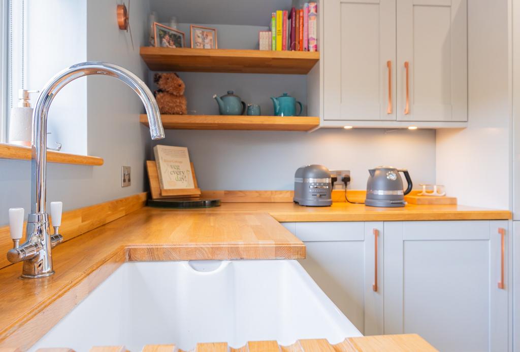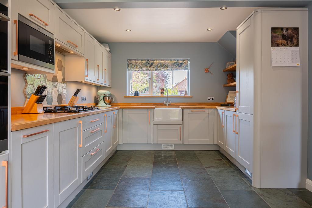 Window to side aspect. French doors to garden. Fitted with a comprehensive range of base and wall units with solid oak working surfaces over. Butler sink with mixer taps. Integrated dishwasher, washing machine and fridge freezer. Built in eye level electric double oven. Inset 5-ring gas hob with concealed extractor hood over.