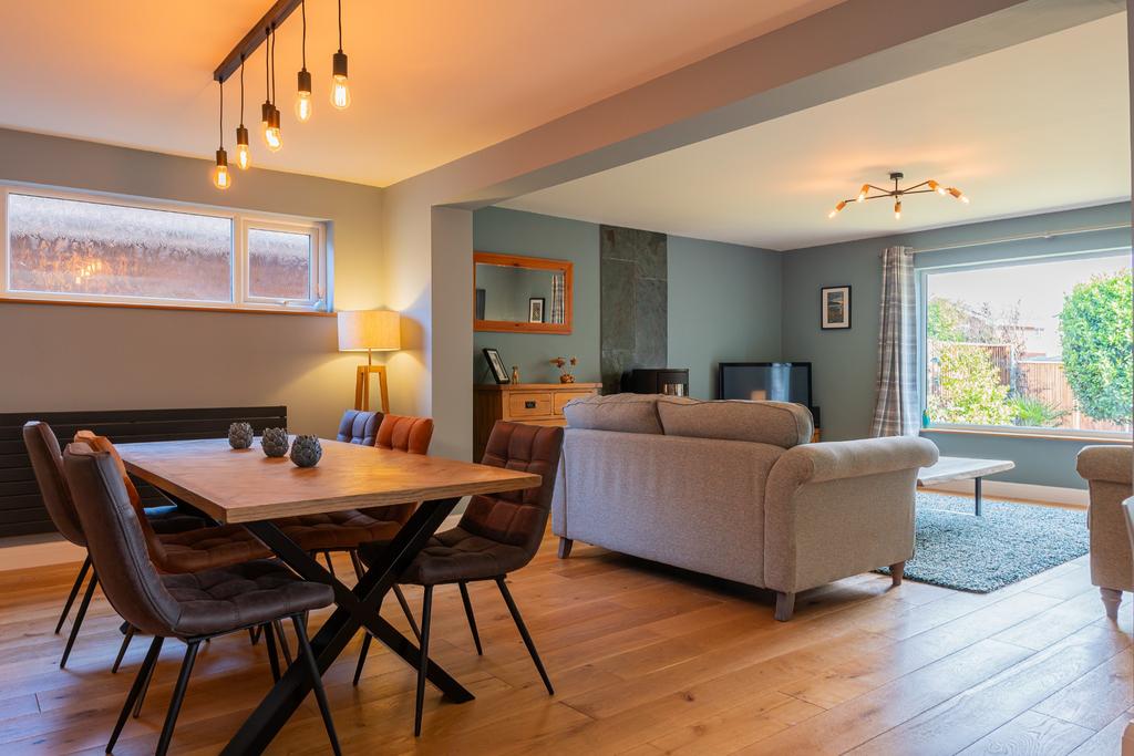 Picture window overlooking rear garden. Window to side aspect. Contura wood burner with tiled hearth and background. Engineered oak flooring. 2 Radiators. Opening to: