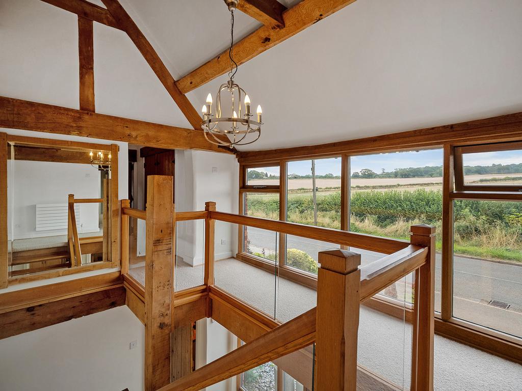 Climbing the oak staircase, you reach the first floor where the breathtaking vaulted atrium awaits. A large feature window on the landing frames stunning views of the Warwickshire countryside, bringing a sense of the outdoors into the heart of the home.