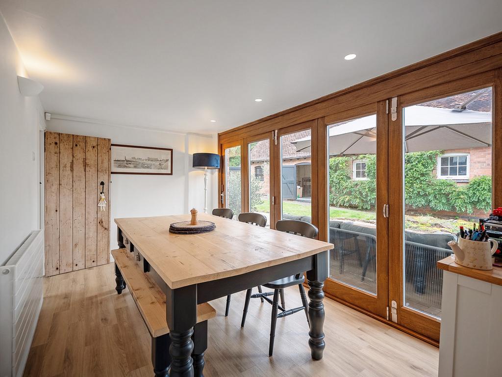 To one side of the atrium, the living room invites you in with its cosy ambiance, where an ornamental inglenook fireplace has been cleverly adapted to house the TV. The warmth of wool Berber carpet, neutral walls, and exposed beams creates a space that feels both timeless and comfortable. The room flows seamlessly into the dining area, where bi-folding doors along the back wall open up to the garden, making it easy to enjoy both indoor and outdoor living.