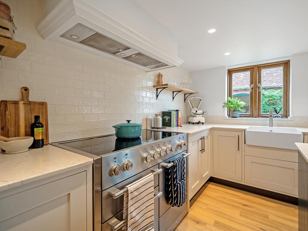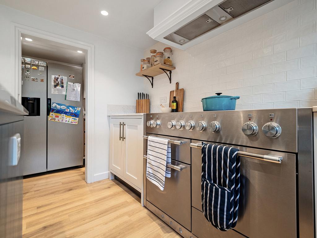 The kitchen, the heart of the home, has been transformed into a chef’s dream. Elegant blue cabinetry pairs beautifully with Silestone quartz countertops, while a substantial central island with several connectivity ports serves as both a functional workspace and a gathering spot for family and friends. The kitchen is thoughtfully equipped with a Neff grill, space for a range cooker and ample storage. High-end touches, like built-in bin drawers, a deep Belfast sink with a Villeroy & Boch mixer tap and integrated Neff dishwasher, add to its appeal. The triple bifolding oak doors not only enhance the flow to the outdoor spaces but also flood the kitchen with natural light, making it a warm and inviting place to cook and connect.