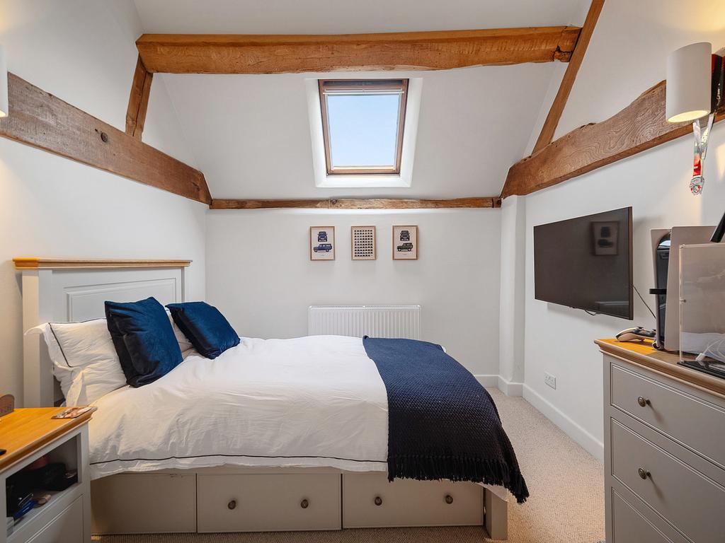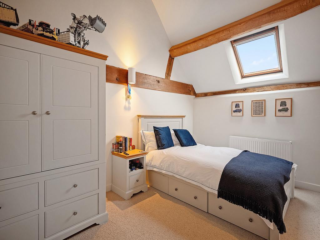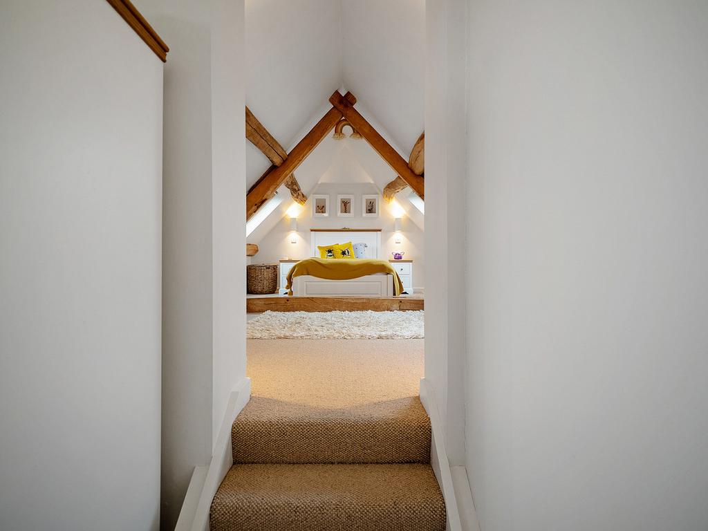 The first floor is home to four beautifully appointed bedrooms, each full of character. The primary suite is a true sanctuary, beginning with a dressing area that leads through an original stained-glass door to a luxurious en suite bathroom. High vaulted ceilings, exposed beams, and a Velux window add to the serene atmosphere, while a large rain head shower, Duravit fixtures, and a sleek hand basin set into a charcoal grey cabinet complete the spa-like retreat. The master bedroom itself is bathed in natural light from three Velux windows, with a new Berber carpet underfoot that adds a touch of warmth and luxury.