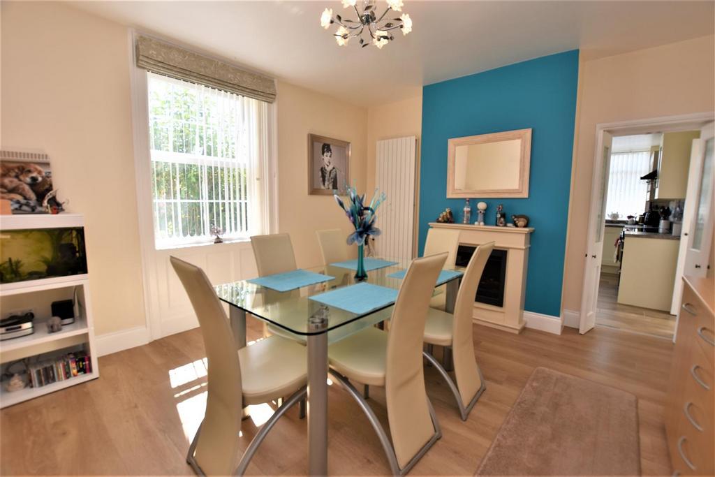 Dining Room - uPVC double glazed window to the front aspect, electric fireplace, wall mounted radiator, wood effect flooring and double opening doors to the kitchen.