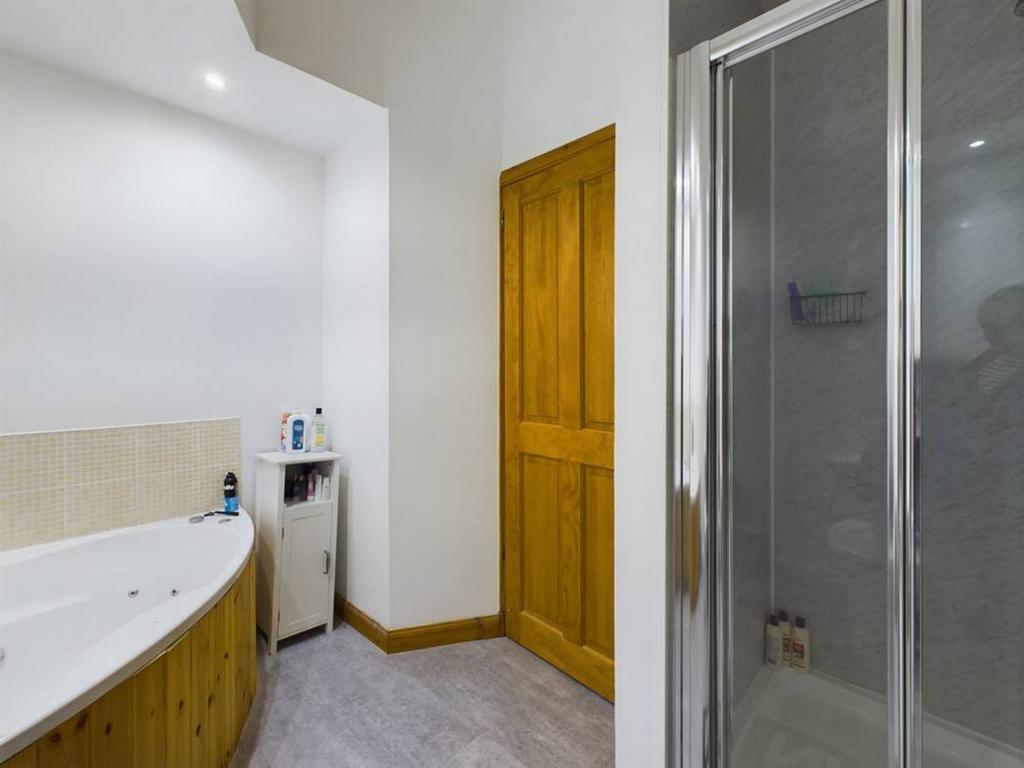 The bathroom on this level is luxuriously appointed with a jacuzzi bath, shower unit, WC, and washbasin.