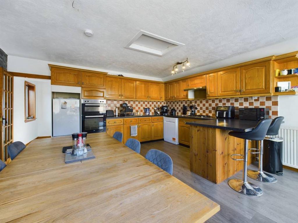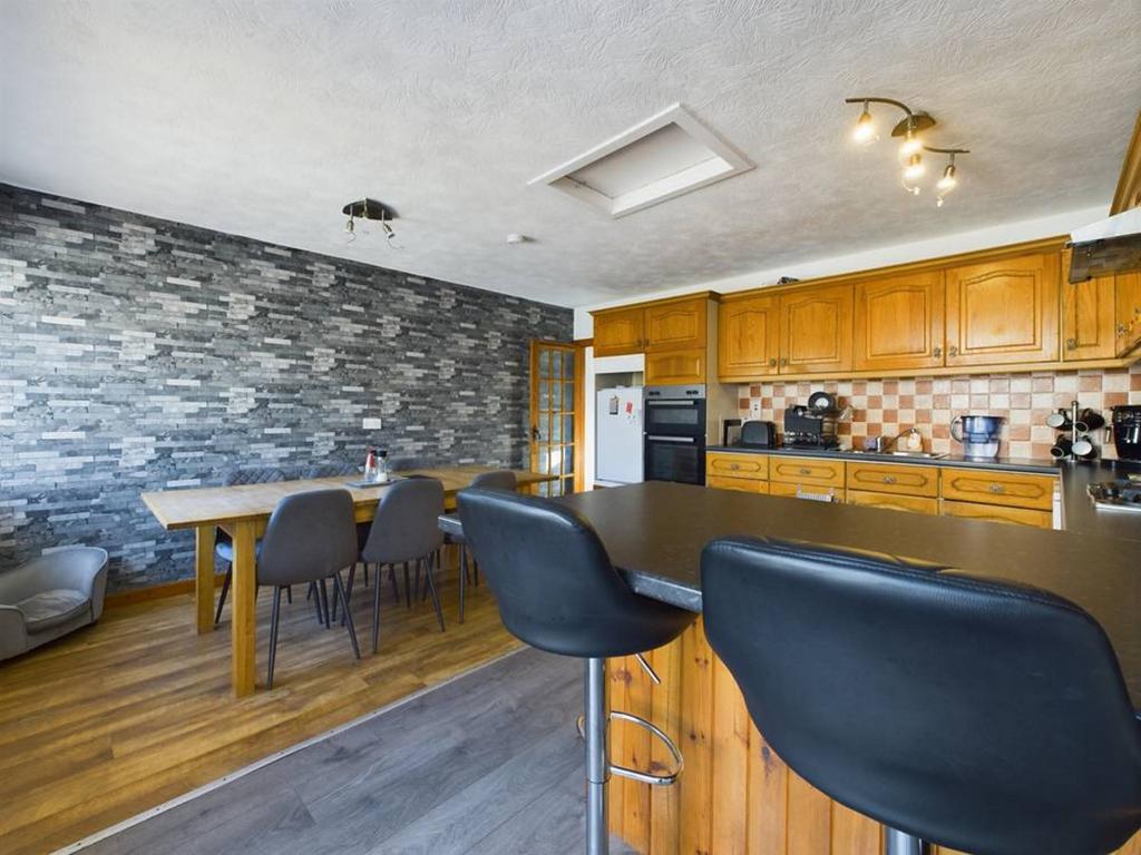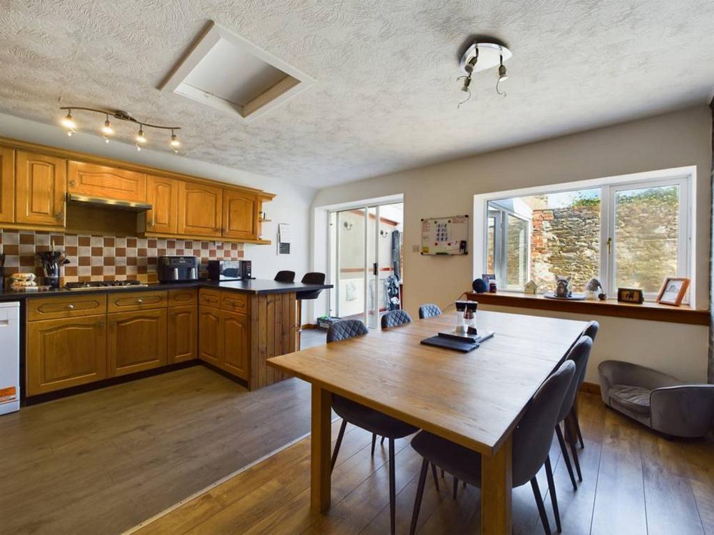 The kitchen/dining area showcases oak cabinetry with contrasting worktops, along with essential appliances such as an oven, dishwasher, fridge, and gas hob. A worktop seating area and space for a dining table make it an ideal spot for family meals, with the added bonus of a sunroom that opens out to the delightful courtyard.