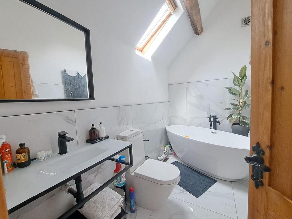 Fitted with a white suite the modern styled bathroom is fitted with a free standing oval shaped bathroom, low level flush w.c., wash hand basin, splashback tiling to the main walls, tiled flooring, ceiling light point, double glazed sky light window, and central heating radiator.