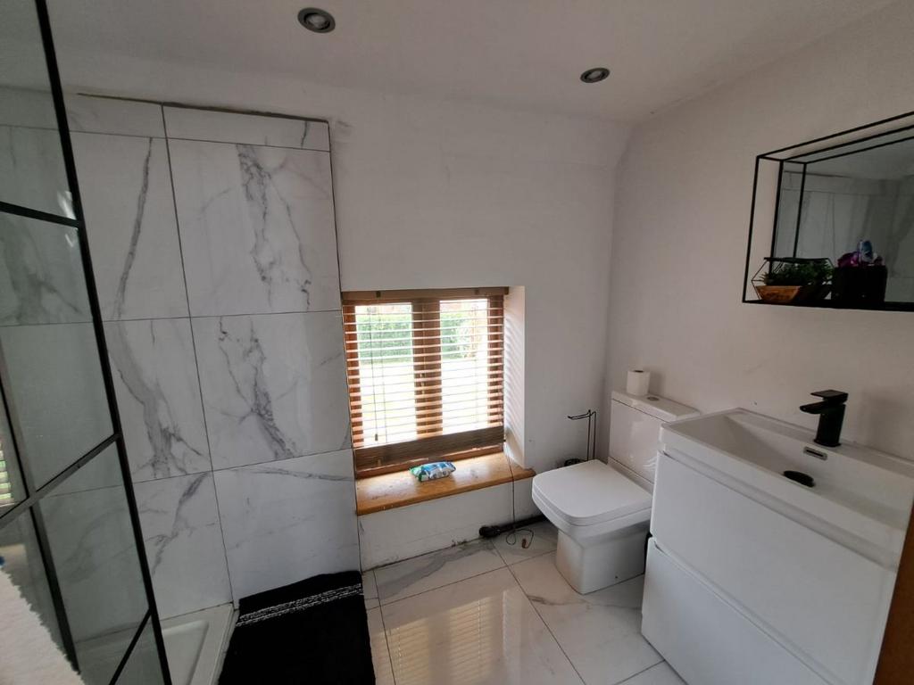 Having shower, low level flush w.c., wash hand basin set within a vanity unit, splashback tiling, tiled flooring, rear aspect double glazed window and ceiling spot lights.