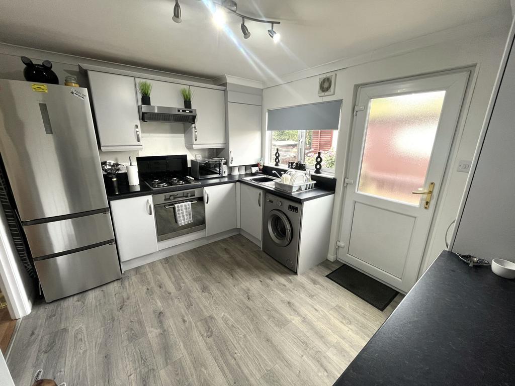 Fitted with a range of modern cupboard and drawer units, fitted worksurface, stainless steel sink and drainer unit with mixer tap, integrated electric oven, integrated gas hob with stainless steel extractor hood, fridge/freezer, washing machine, concealed gas fired boiler, radiator