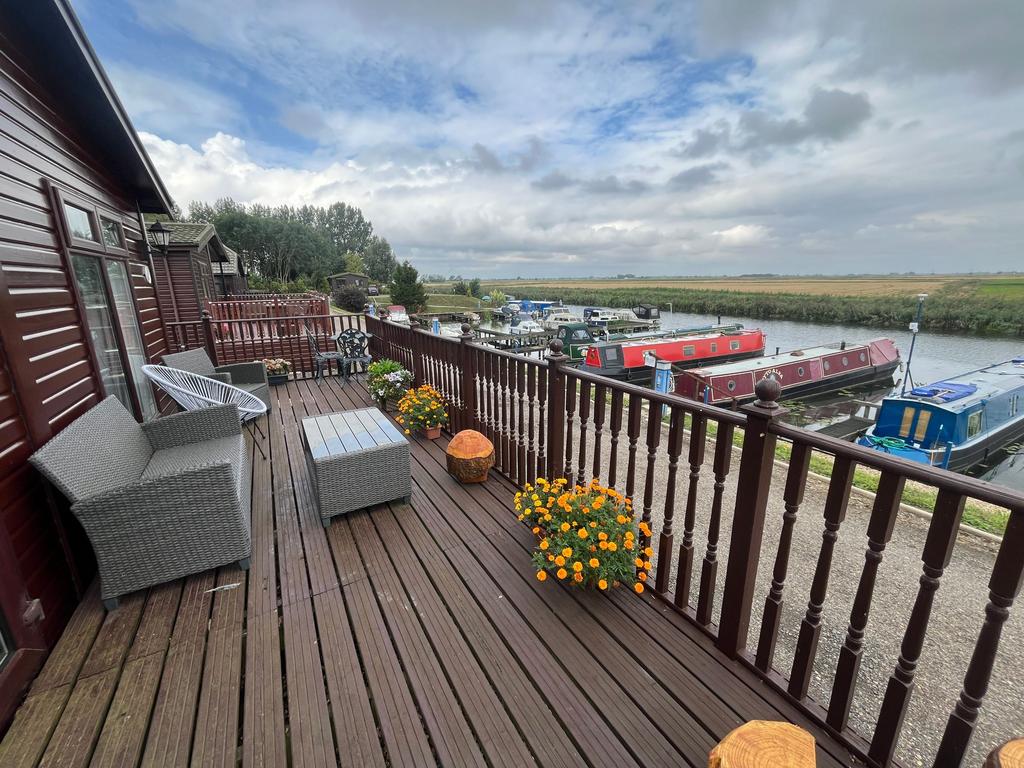 This lodge features a wooden veranda to the front and side allowing a lovely seating area with views out over the River Nene.