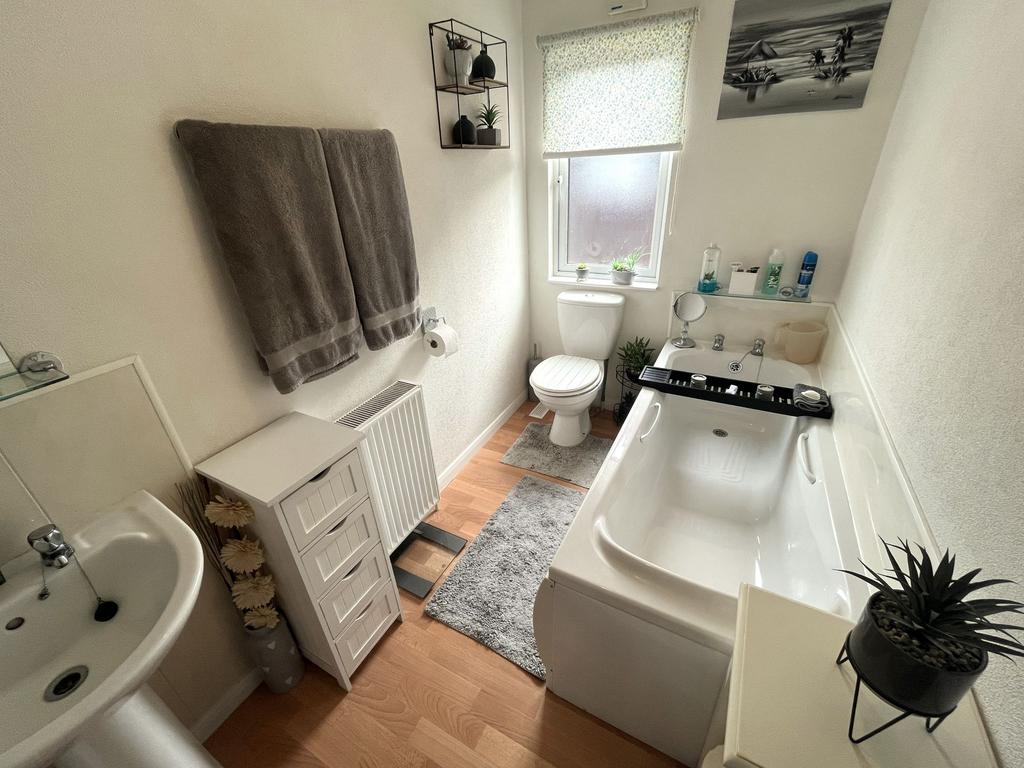Double glazed window to side, low level WC, pedestal wash hand basin with tiled splash back and wall mirror, panelled bath, radiator