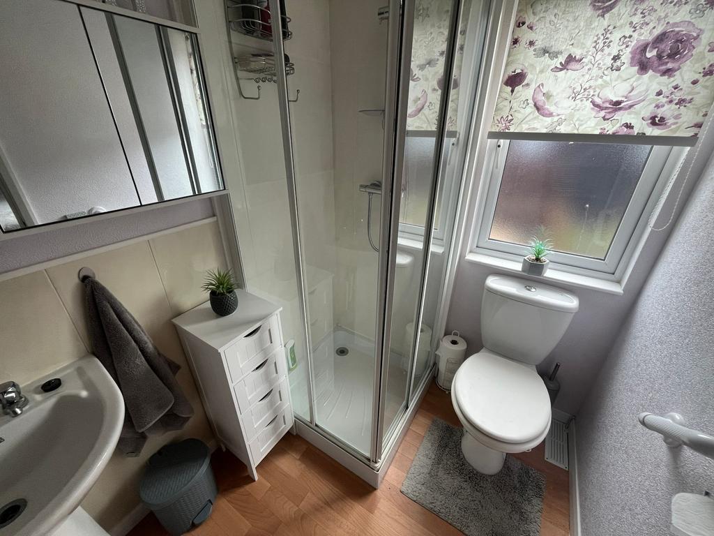 Double glazed window to side, low level WC, pedestal wah ahnd basin with tiled splash back, tiled shower cubicle with wall mounted shower head attachment
