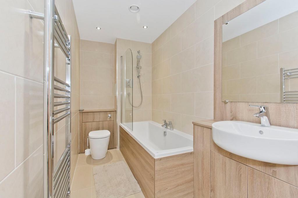 The elegant bathroom, fitted with modern fixtures offers a three piece suite including electric shower over bath and also benefits from a heated towel rail.