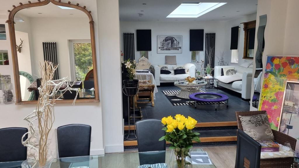 A welcoming entrance porch with retractable awning leads to the Reception Hall entrance door, having good views through multiple windows towards the estuary and rolling countryside beyond. There are double doors to a large Study, with views over the garden. A feature arch opens to the Sitting Room with bay windows, stairs to the first floor and a feature fireplace with stone surround and log-burning stove. A lobby opens to the Ground Floor Cloakroom /Shower Room. From the ground floor sitting room, a feature oak panelled door leads to the extended/refurbished part of the house being wonderfully light and free-flowing. The elegant Kitchen area has a stylish range of units with high-gloss fronts and is complimented by extensive and contrasting areas of quartz-style work surfaces together with oak block surfaces. There is clever lighting, and an expansive island unit has an inset ceramic hob with filter over. Integrated appliances include a full-height fridge and separate freezer, an oven, microwave, warming drawer and dishwasher. There is a separate Laundry Room, also being very well-equipped with a good range of units, extensive work surface and under-surface space for utility appliances. The wonderful open-plan reception rooms wrap around the kitchen/laundry room space and comprise a Conservatory / Atrium area opening to the outside and with good views across the gardens that in turn opens to a wonderful Dining Room/Entertaining Space with feature hipped lantern skylight, contemporary style column radiators and sliding-folding doors to two elevations leading onto extensive decking, creating a wonderful sense of inside/outside living. This space opens to a higher level stylish Living room with another skylight as described and 2 contemporary-style column radiators that in turn opens to a Snug, completing these spaces perfectly and opening back down into the kitchen.