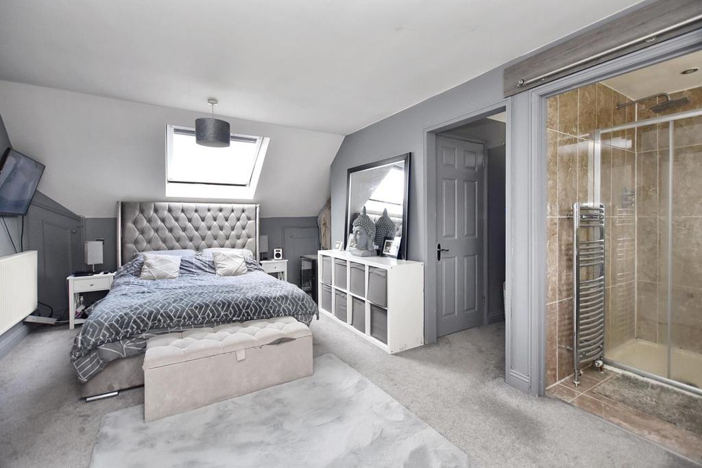On the first floor, there are three spacious double bedrooms and a well-appointed shower room. The top floor is dedicated to a luxurious master bedroom, complete with an ensuite bathroom for added comfort and privacy.