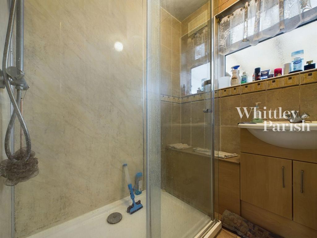 With window to rear comprising walk-in shower and hand wash basin over vanity unit.