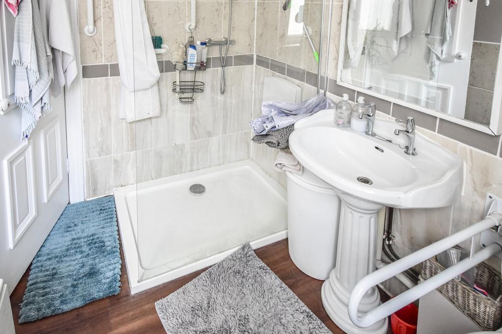 A four piece suite comprising panel bath, walk in double base shower housing mains shower, wash hand basin, low level W.C, textured ceiling with coving, wall mounted Worcester boiler (supplying domestic hot water and gas central heating) and double glazed frosted window to side aspect.