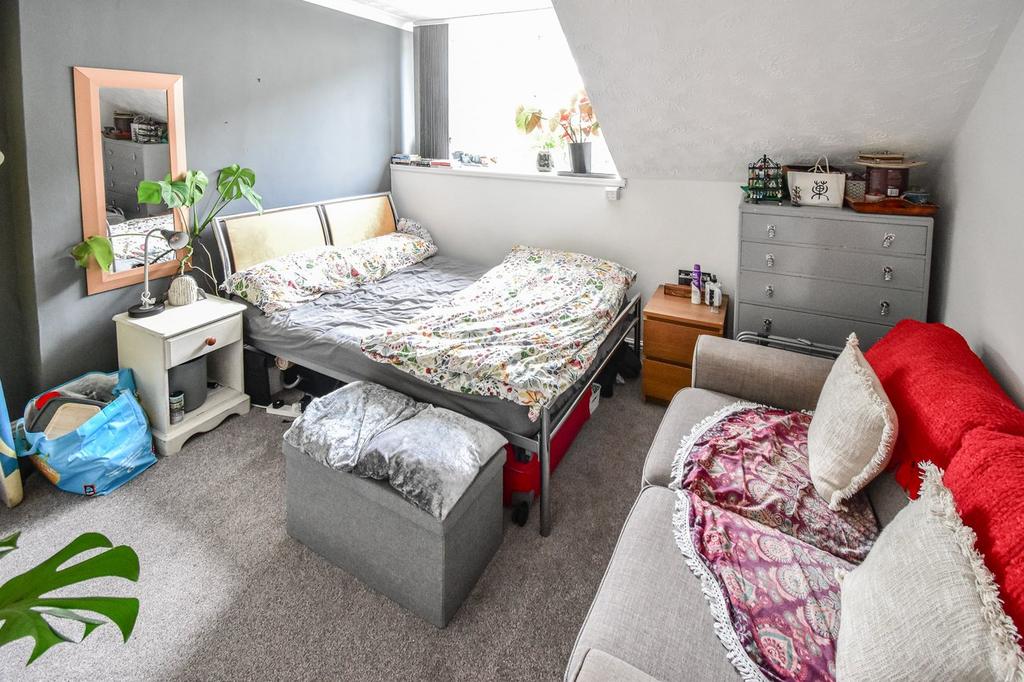 With airing cupboard space, attic hatch, fitted wardrobes, textured ceiling with coving and double french doors to the rear..
