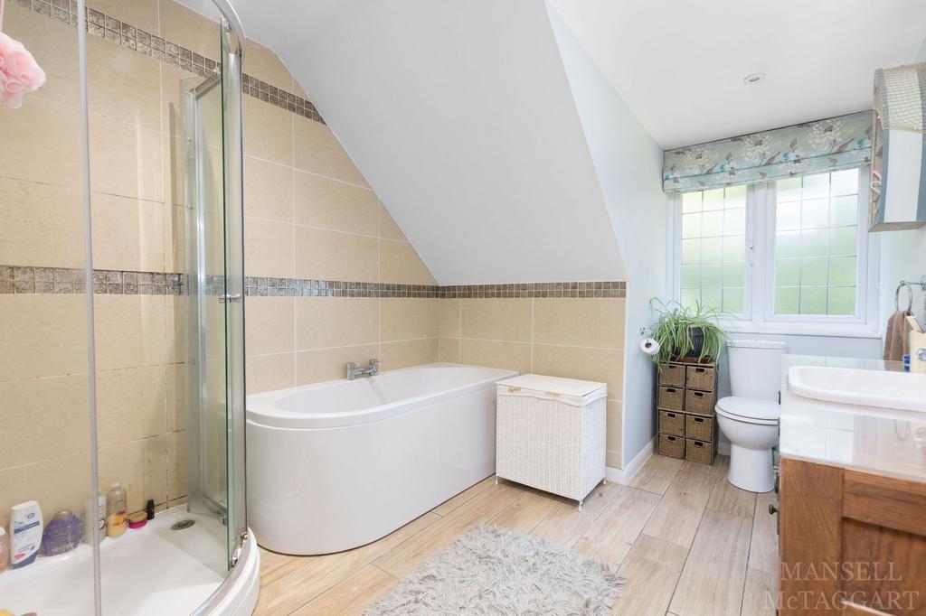 The family bathroom is spacious with a white suite comprising a large oval bath, WC and wash hand basin with a bespoke wooden vanity unit with drawers and storage with wall tiles in neutral colours edged with smaller tiles in gold/bronze tiling. There is a separate shower cubicle and a window to the side of the house.