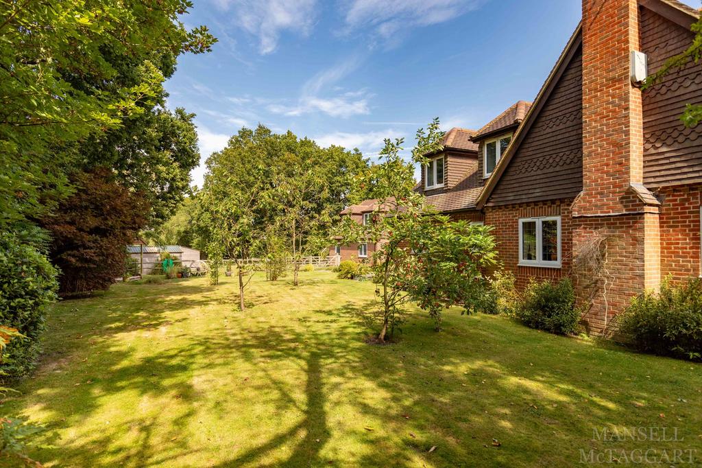 The front garden has flowers, shrubs and lawn and it wraps around the house with a Summer House off to the side. There are sleepers along the driveway with planting and along the boundaries there are fences, shrubs and trees.