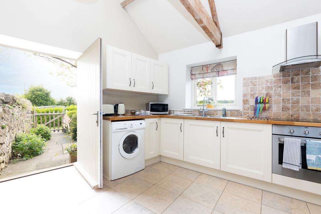 The cottage is all on one level and beautifully decorated and furnished. Through the wooden gate and up the stone paved path and you arrive at the front door complete with climbing rose. It really does feel like an escape to the country! The lawned garden wraps around the stone cottage and has countryside views across to the Mendip.