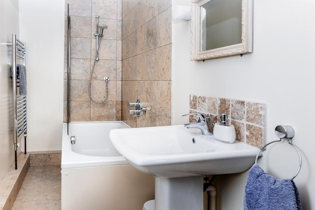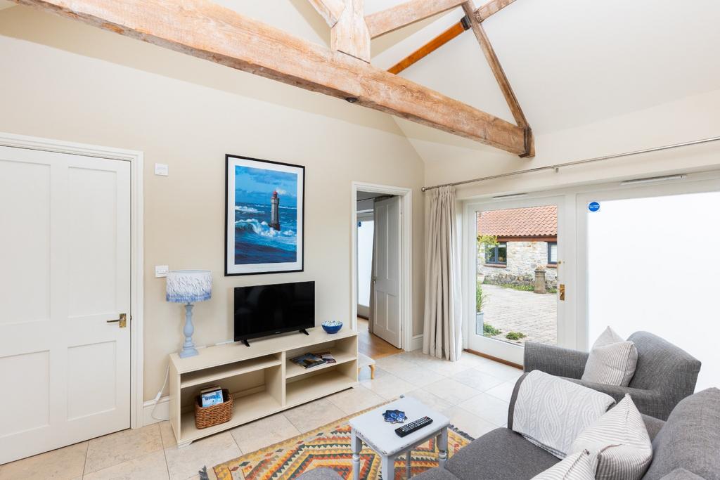 The open plan kitchen/living room is stylish as well as spacious. There are exposed beams into the eaves, a travertine floor and large windows that let the light flood in. The kitchen has an induction hob, an electric cooker, a washing machine/tumble dryer and fridge. The cottage comes with a dining table and a seating area complete with TV.