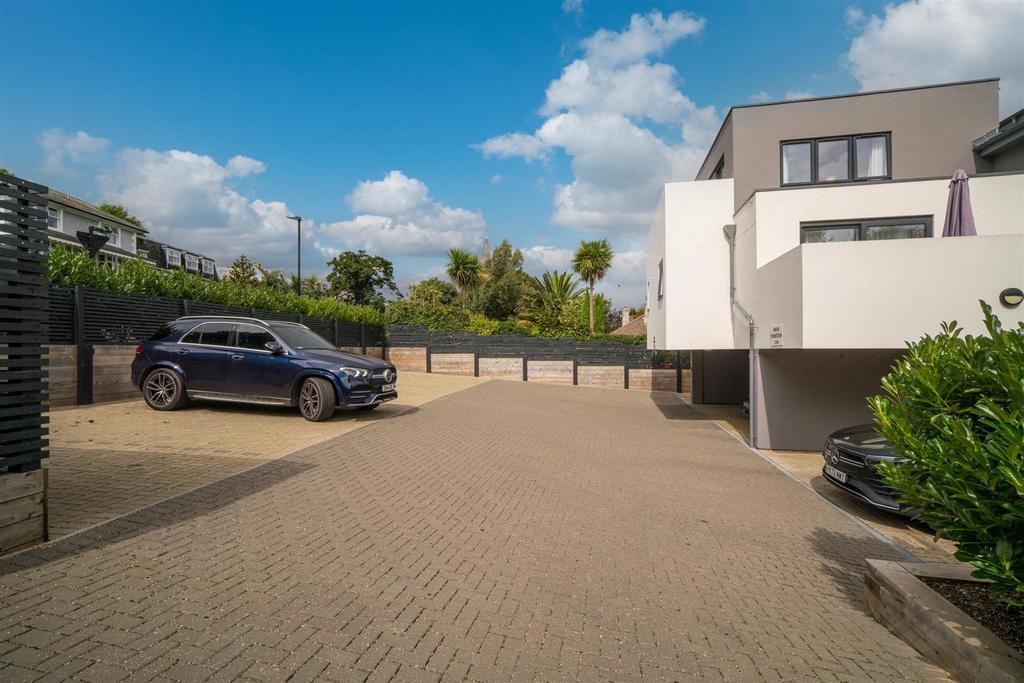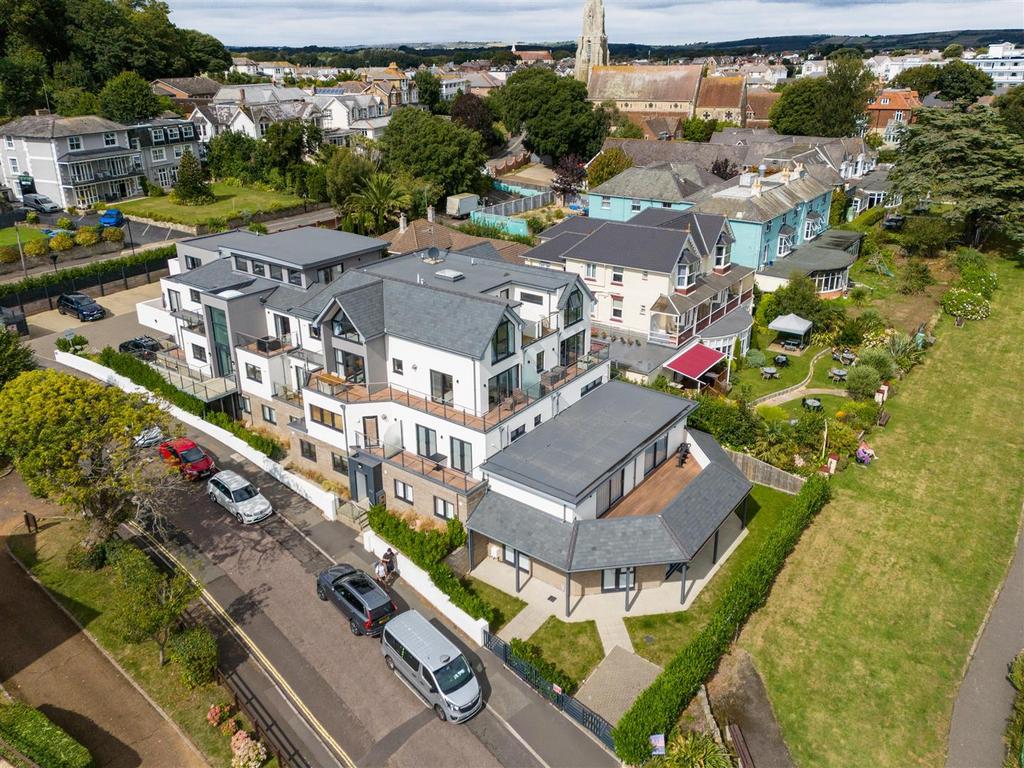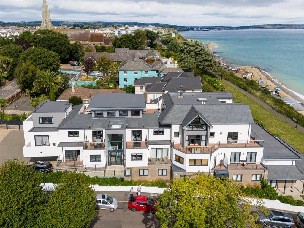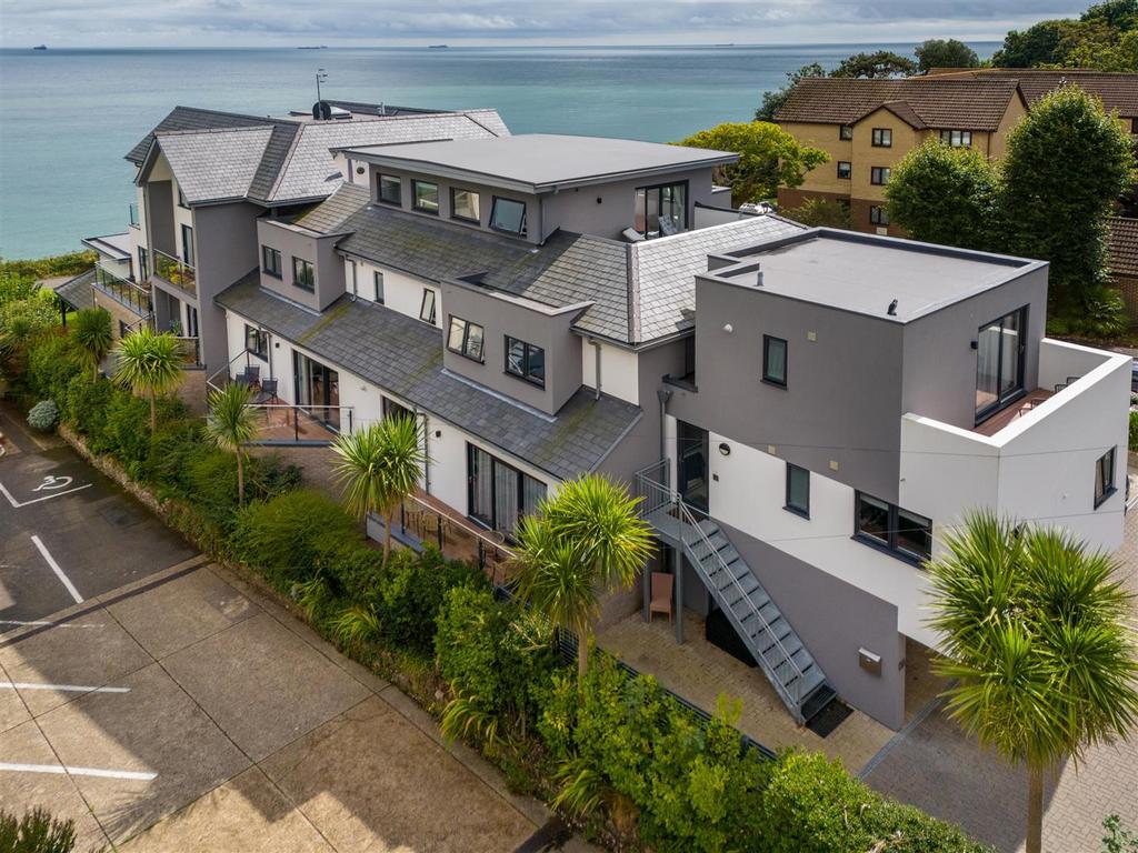 The attractive development was designed by award-winning architect Lincoln Miles and comprises glazed balustrades set against rendered elevations, a slate tile roof and the development comprises only 14 apartments all with dedicated off-road parking and high specification interiors. There are uPVC sliding doors onto private balconies and luxury vinyl floors, whilst interiors have been styled to provide a tasteful, executive finish boasting great kitchens and bathrooms and generous proportions throughout. Apartment 9 is accessed on the ground floor with an upside down living arrangement, comprising cloakroom and two bedrooms, both of which enjoy ensuite bathrooms and access to the private terrace. Stairs lead to an open plan kitchen, dining, living area on the first floor as well as a separate W.C. and large balcony enjoying glorious views over The Bay and to the English Chanel. Externally the property is beautifully maintained with raised planters incorporating Laurell hedging, beds with Agapanthus and coastal sea grasses and a bin store concealed by charcoal painted trellis.