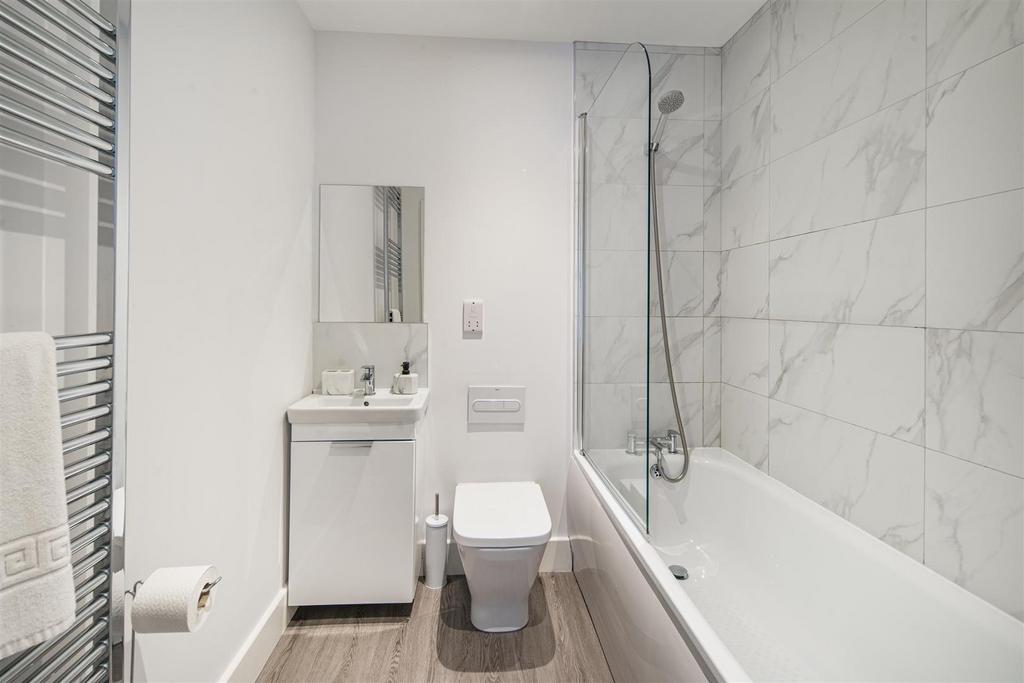 With panelled bath with shower over, tiled walls, tall towel radiator, vanity unit wash basin and hidden cistern W.C.