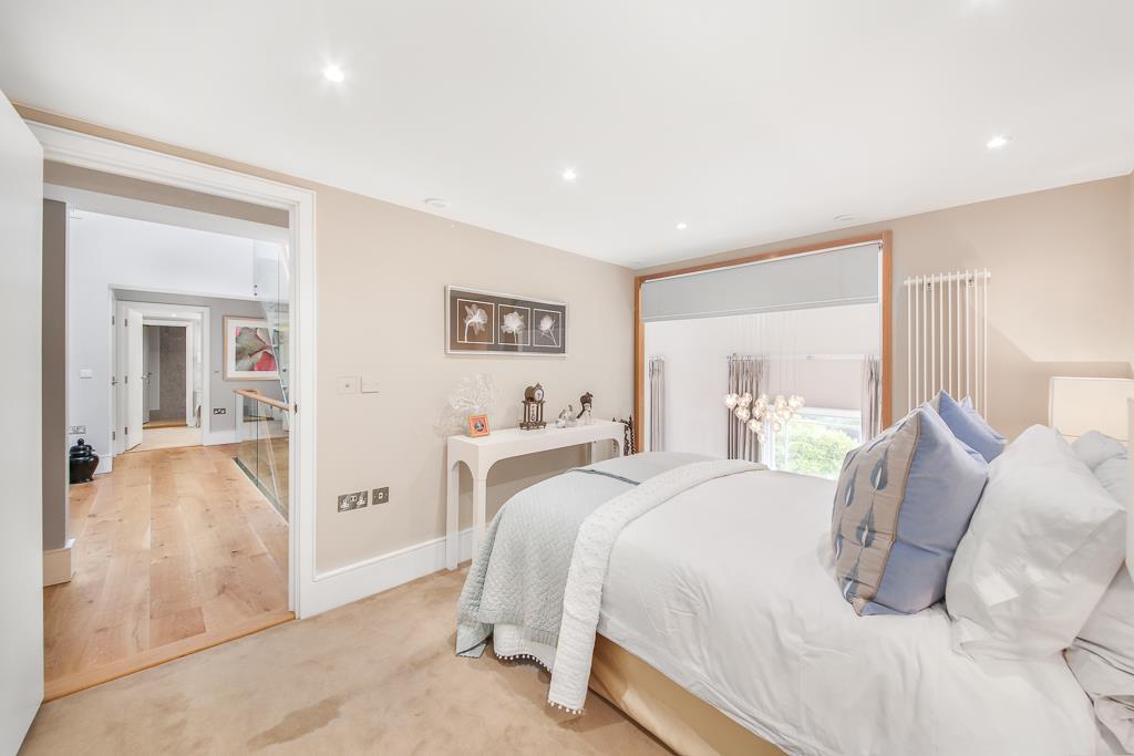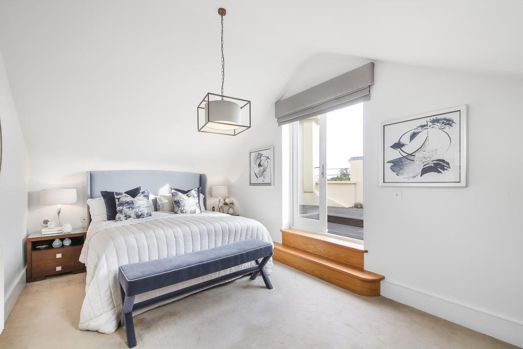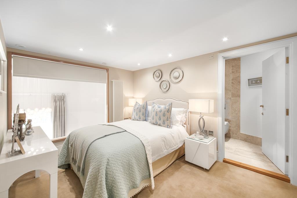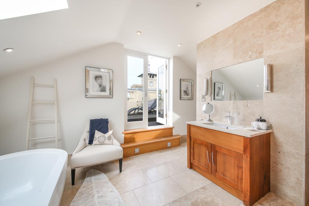 On the first floor are two double bedrooms, each with built-in wardrobes and en-suite shower rooms. The top floor houses the impressive principal suite, which includes a spacious bedroom, dressing room with fitted wardrobes, a luxury bathroom with a freestanding bath and separate shower, plus access to two private roof terraces.