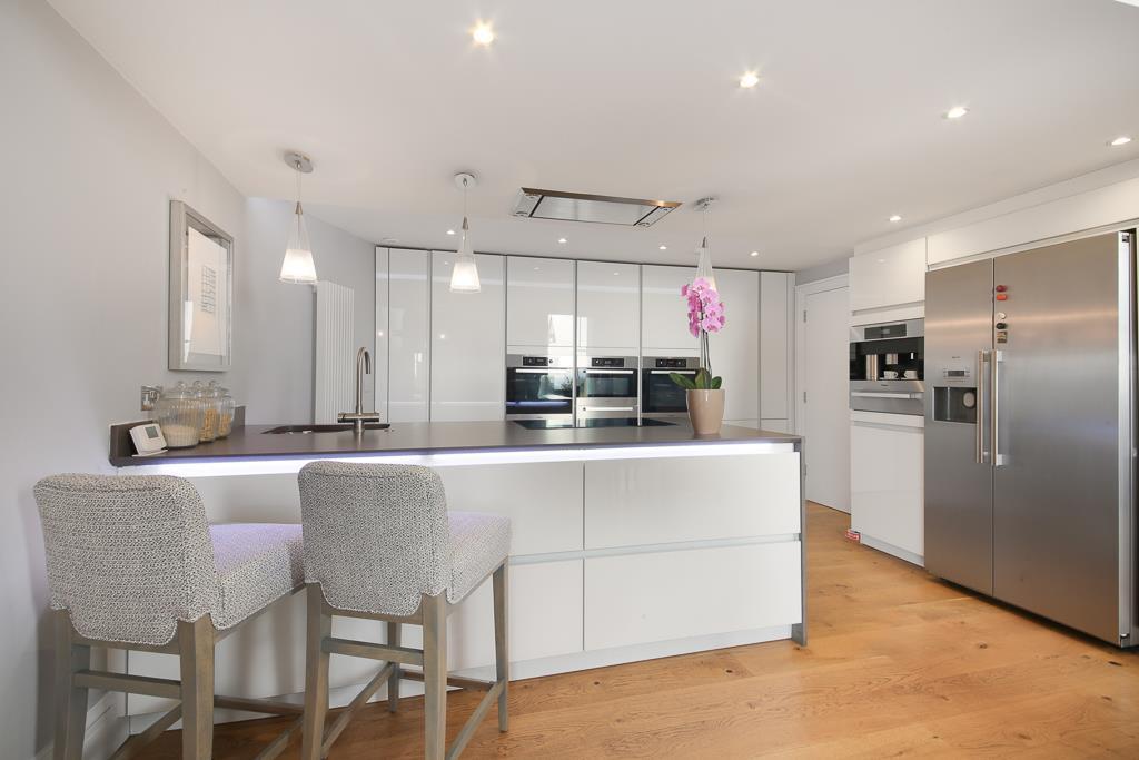 The centrepiece of the apartment is a spacious open-plan reception room featuring double-height ceilings and full-height sash windows that open onto a large balcony. The room is divided into a modern kitchen/dining area and a snug/TV space. The kitchen is a sleek Ballerina design, fully equipped with Miele appliances and stone worktops, ideal for both entertaining and family living.