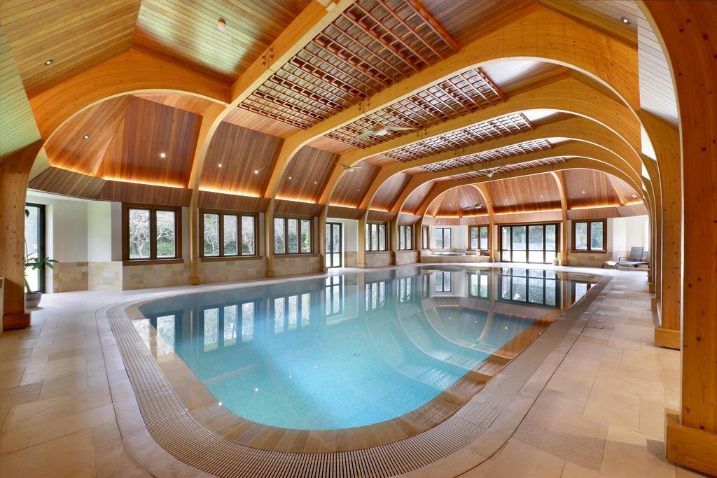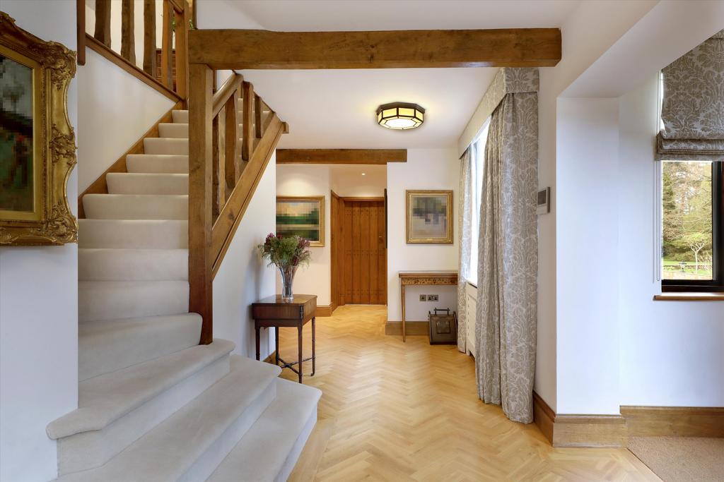 The ground floor is entered through a wide reception hall giving access to the principal reception rooms, study and playroom. The drawing room with lovely fireplace, sitting room and dining room all have a southerly aspect across the gardens and to the woodland beyond. The kitchen is very well fitted, with a good-sized pantry on the northern end. From the kitchen, double doors open into the garden room, again facing south over the gardens and grounds - from here, a further door leads to the swimming and leisure wing with large heated pool, gym, sauna, steam room and changing room. There is also a large coats and boots room to the rear of the kitchen.