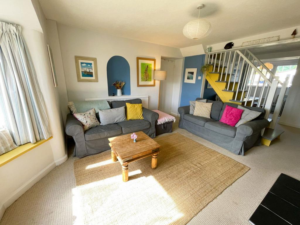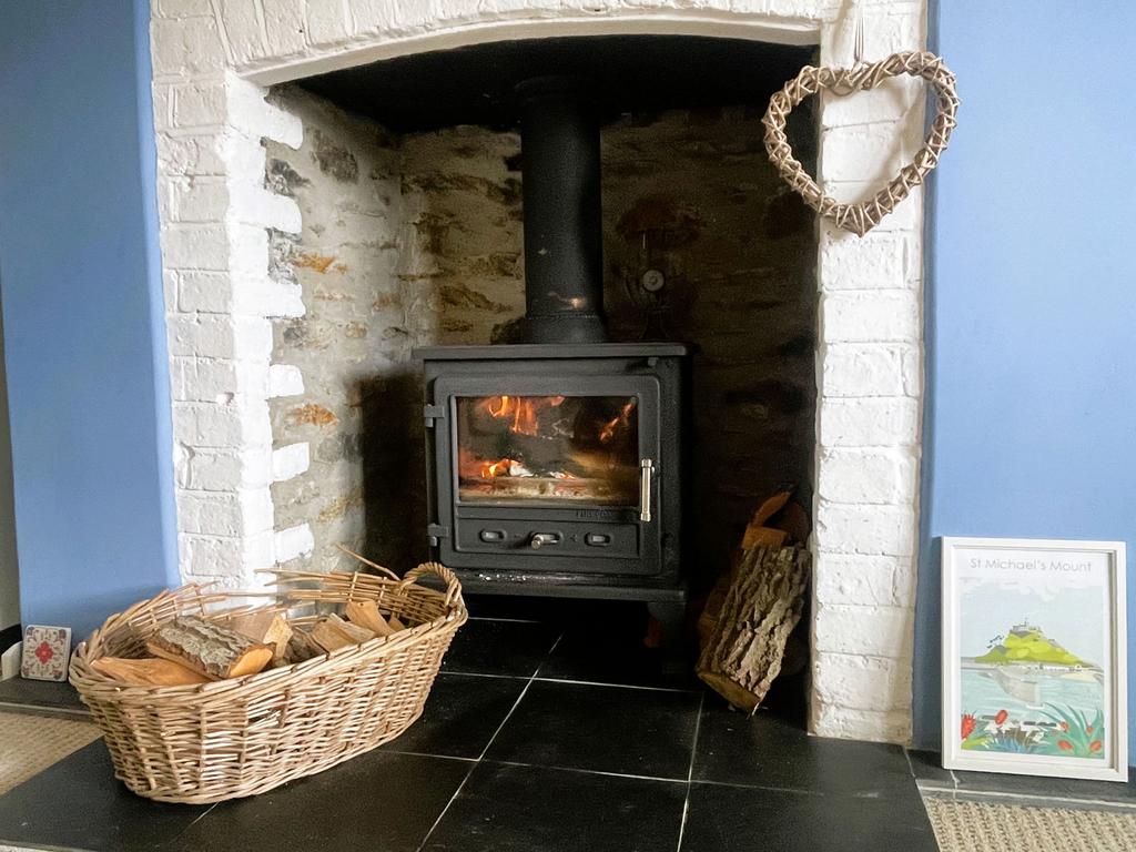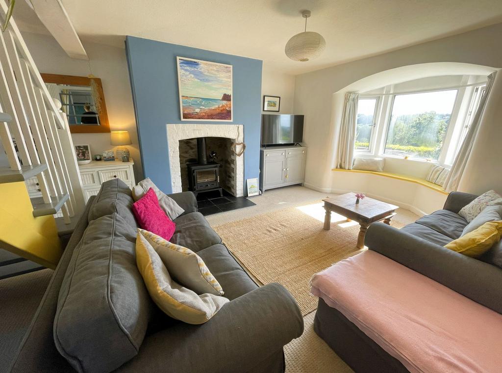 Double glazed bay window to front with window seat and lovely views, stairs to first floor, radiator, light and power points. Feature stone fireplace with inset 'Firebox' log burner on a slate hearth.