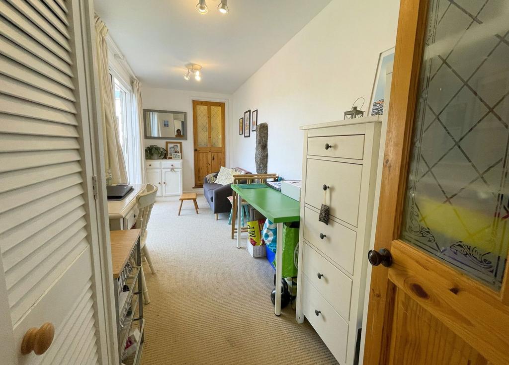 Currently used as a home office, with a porthole feature window to front, space for coat hanging, door to: