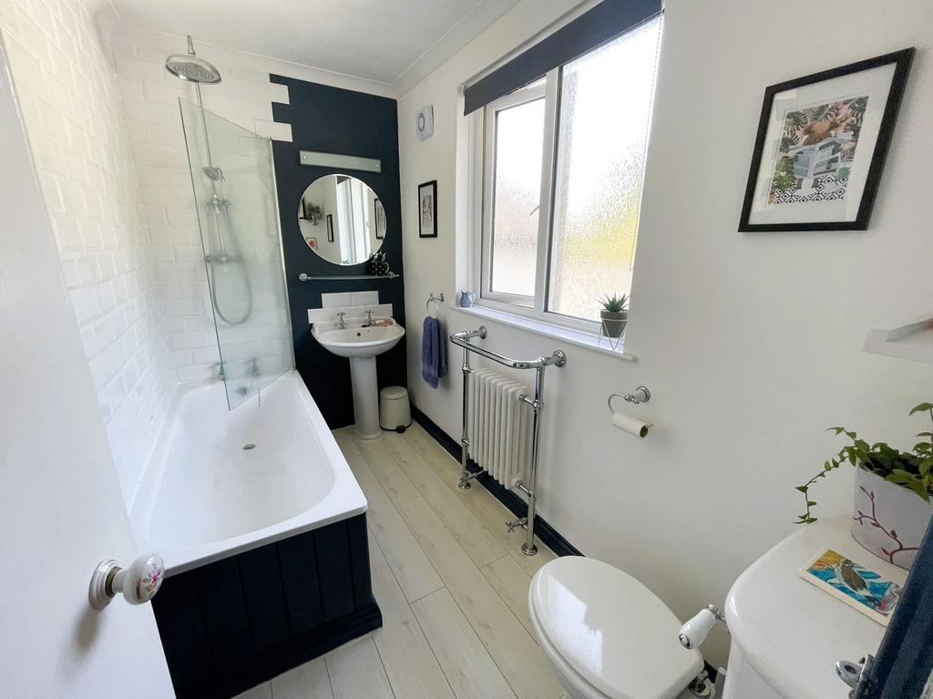 Obscure double glazed window to rear with lovely views over the garden and fields beyond, panelled bath with traditional style mixer shower over and glass screen, pedestal wash hand basin, low level wc. Feature radiator with chrome towel rail, extractor fan, ceiling light, tiled splashbacks.