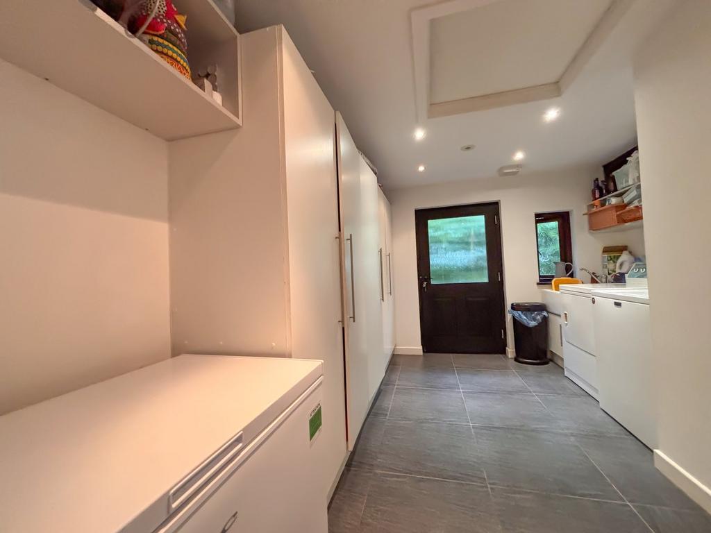 Range of tall storage cupboards. Belfast sink unit, loft access, side entrance door and window. Gas boiler which runs the hot water and hot blower air heating system.