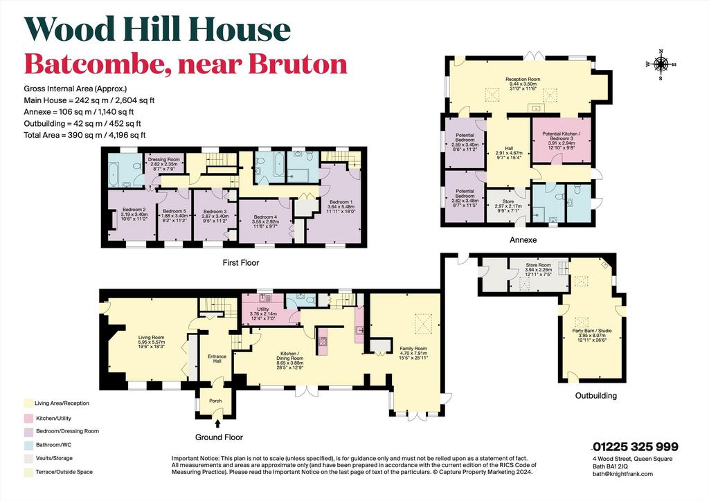On the first floor is the principal bedroom with en suite shower room, a guest bedroom suite with bathroom and dressing room, a single bedroom/nursery, two further double bedrooms and the family bathroom. There are two staircases, one from the entrance hall and the other from the kitchen.