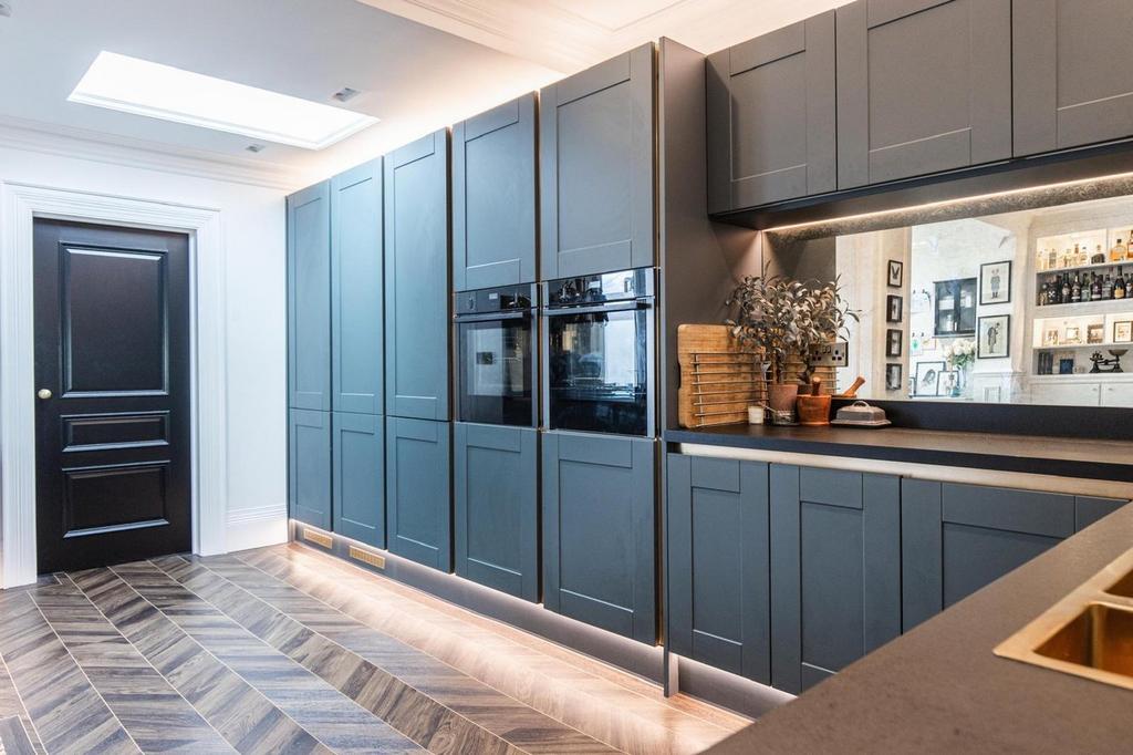Range of matching contemporary wall and base units with work surfaces over, inset 1 1/2 bowl sink inset and drainer, built in twin NEFF ovens, built in larder fridge and freezer, 5 ring gas hob fitted to further area of work surface with breakfast bar opposite and extractor over, door to utility.